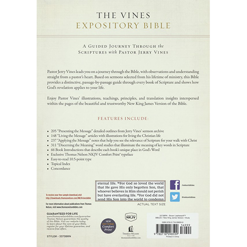 The New King James Version Vines Expository Bible offers scriptural truth alongside guided explanations of key passages from influential preacher Dr. Jerry Vines. With biblical exposition and practical teaching culled from years of faithful ministry, Dr. Vines presents helpful insights from God's Word that are presented in a warm, pastoral manner.