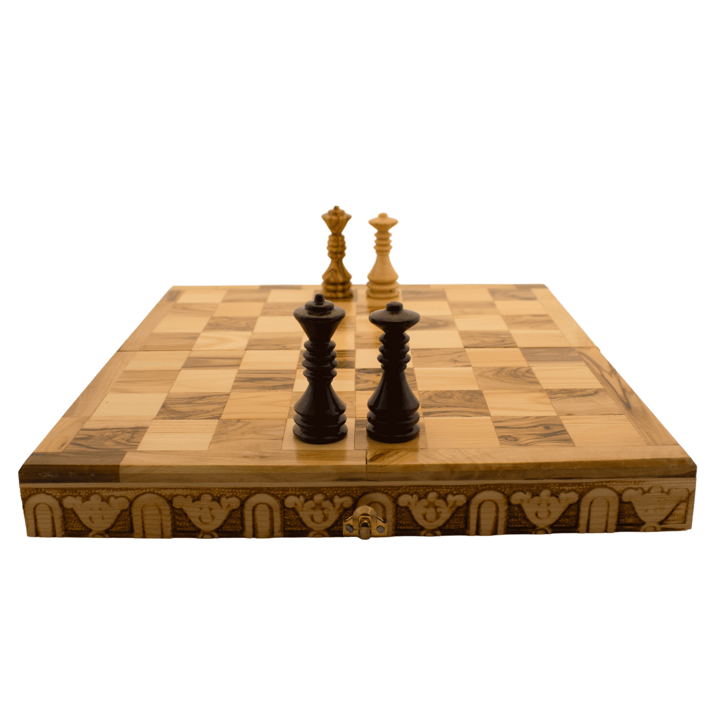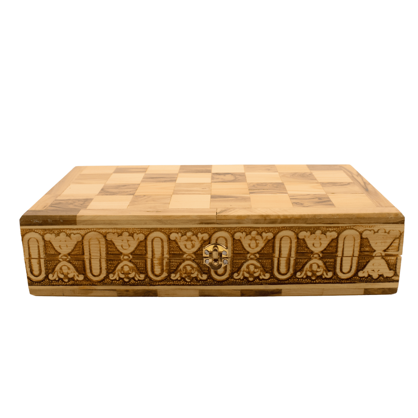 This olive wood chess and Backgammon box is a versatile game set that combines the classic games of chess and backgammon in one convenient box. Crafted entirely from olive wood, the outside of the box features a chessboard and a backgammon board on the inside.