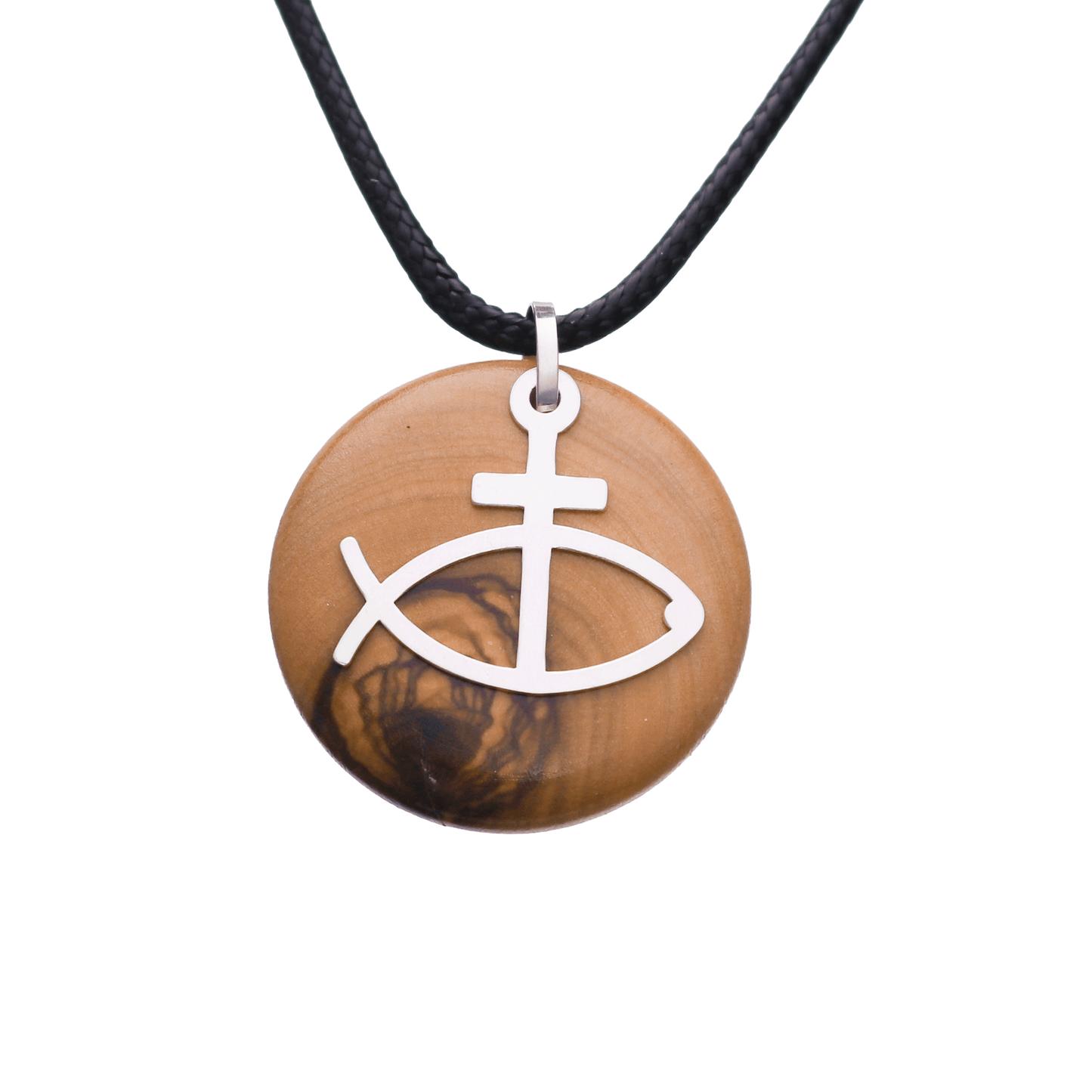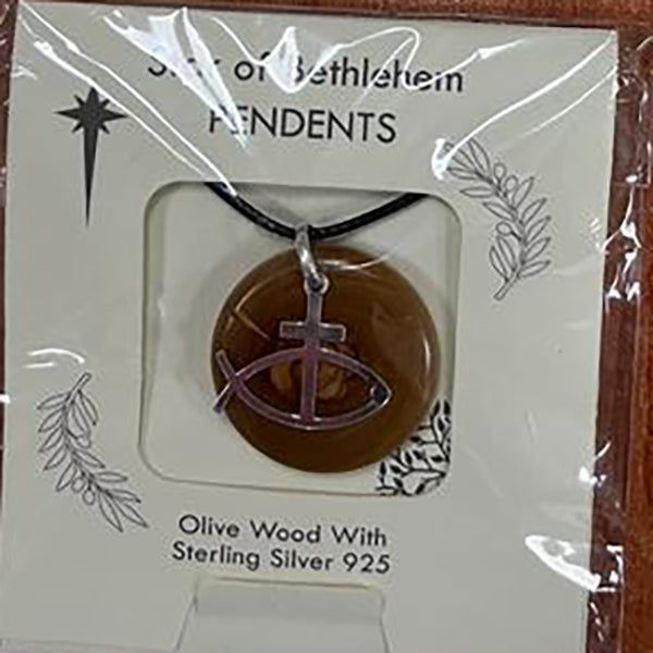 Adorn yourself with this beautiful olive wood necklace. The necklace features a round olive wood disc as its base, highlighted by a sterling silver fish with cross overlay pendant. The contrasting materials create an eye-catching effect, showcasing the unique grain patterns of the olive wood.