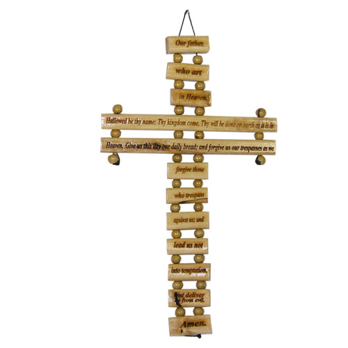 This is a hand-carved cross made from the native olive trees of the Holy Land. It has been hand-crafted using slats and beads which are strung together with a brown cord and can be hung as a wall decoration. On each panel of this elegant cross is a phrase of the Lord's prayer.