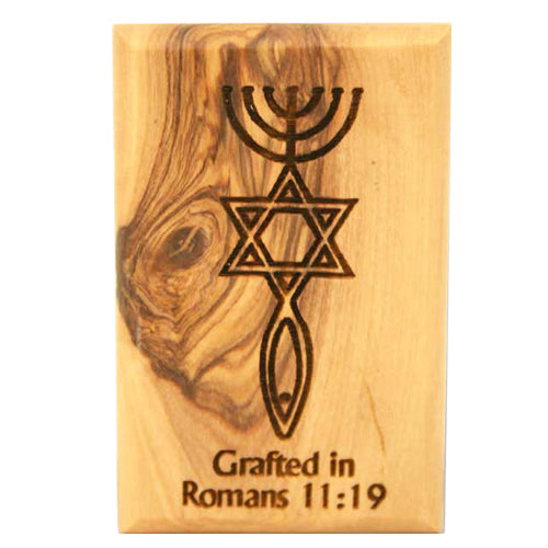 Olive Wood Magnet With Laser Cut Grafted-In Symbol and Sentiment. Romans 11:19. Laser Cut Olive Wood Magnet.
