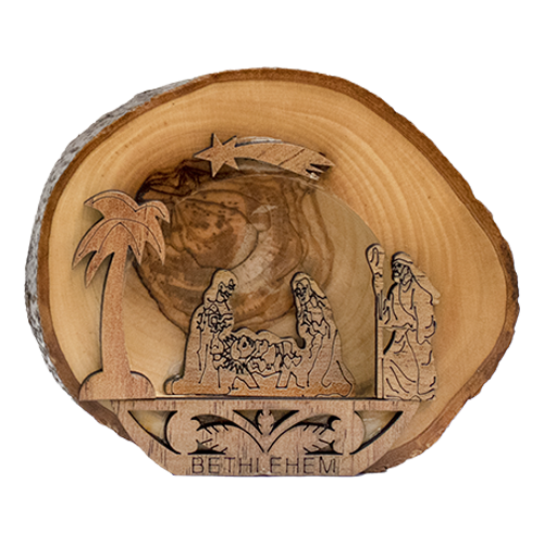 This is a beautifully crafted one-piece manger with figures including Joseph, Mary, Baby Jesus, and a shepherd. Cut from a single slice of olive wood this is an amazing piece.