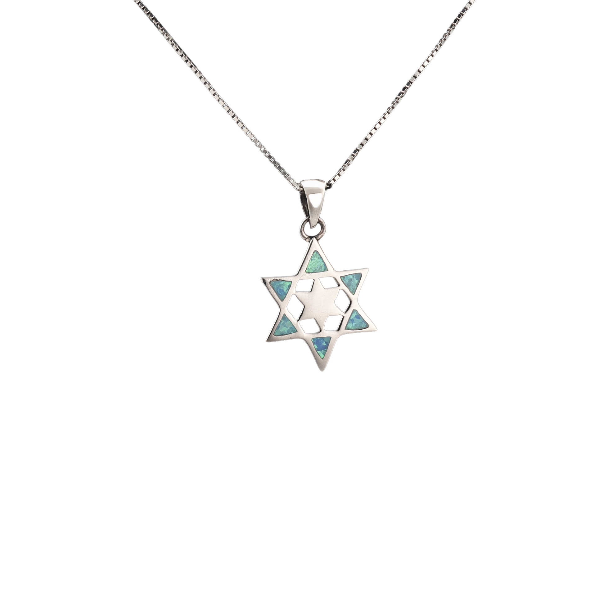 A unique pendant featuring two layered Star of David designs accented with luminous opal. The opal’s natural play of color adds subtle brilliance to the classic form. Elegant, meaningful, and perfect for everyday wear or as a thoughtful gift.