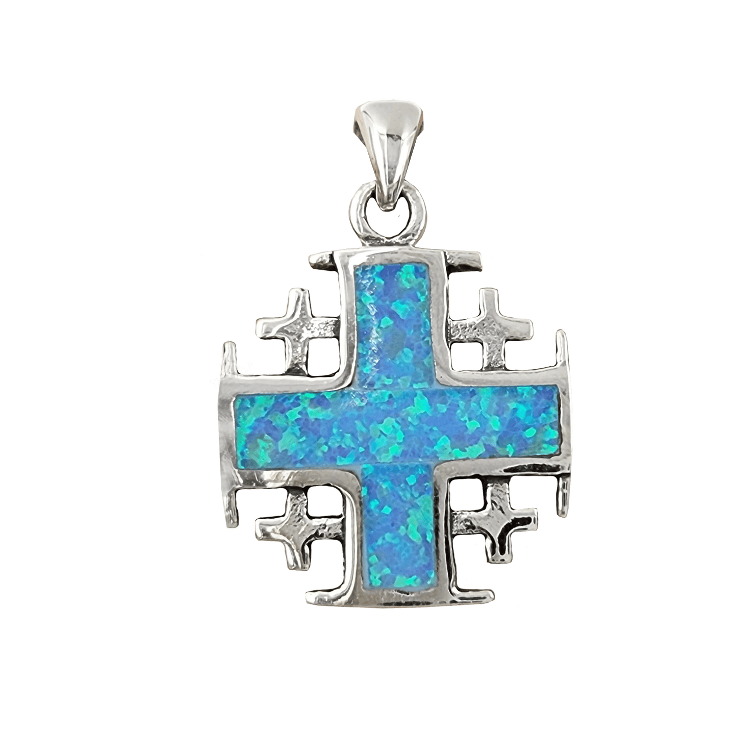 Whether as a personal keepsake or a thoughtful gift, this sterling silver Jerusalem Cross pendant with synthetic opal is a timeless piece that celebrates faith, heritage, and modern elegance.