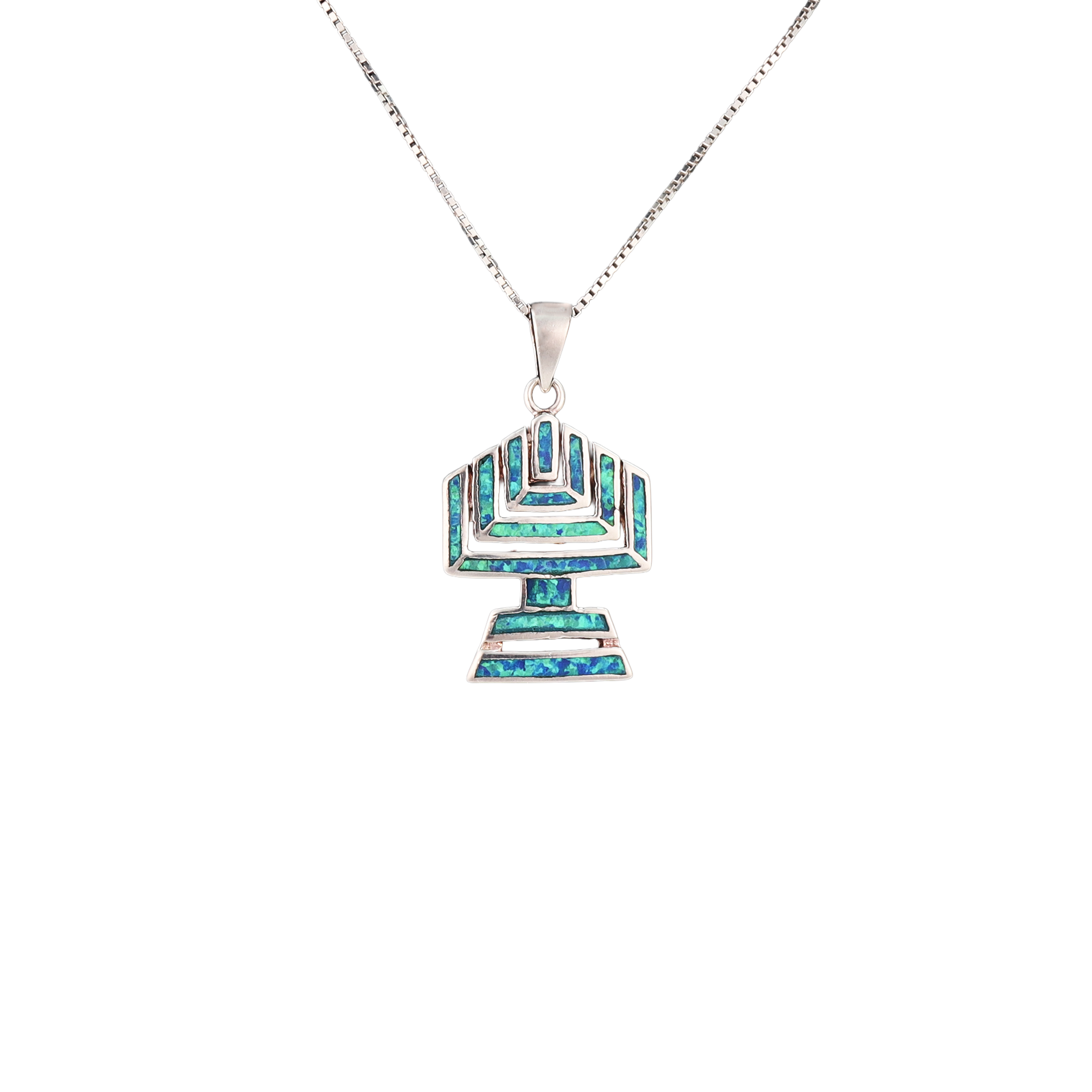 A beautiful pendant featuring a menorah design accented with luminous opal stones. Set in a polished frame, the opal adds subtle color and elegance to this meaningful symbol. Perfect for everyday wear or as a thoughtful gift.