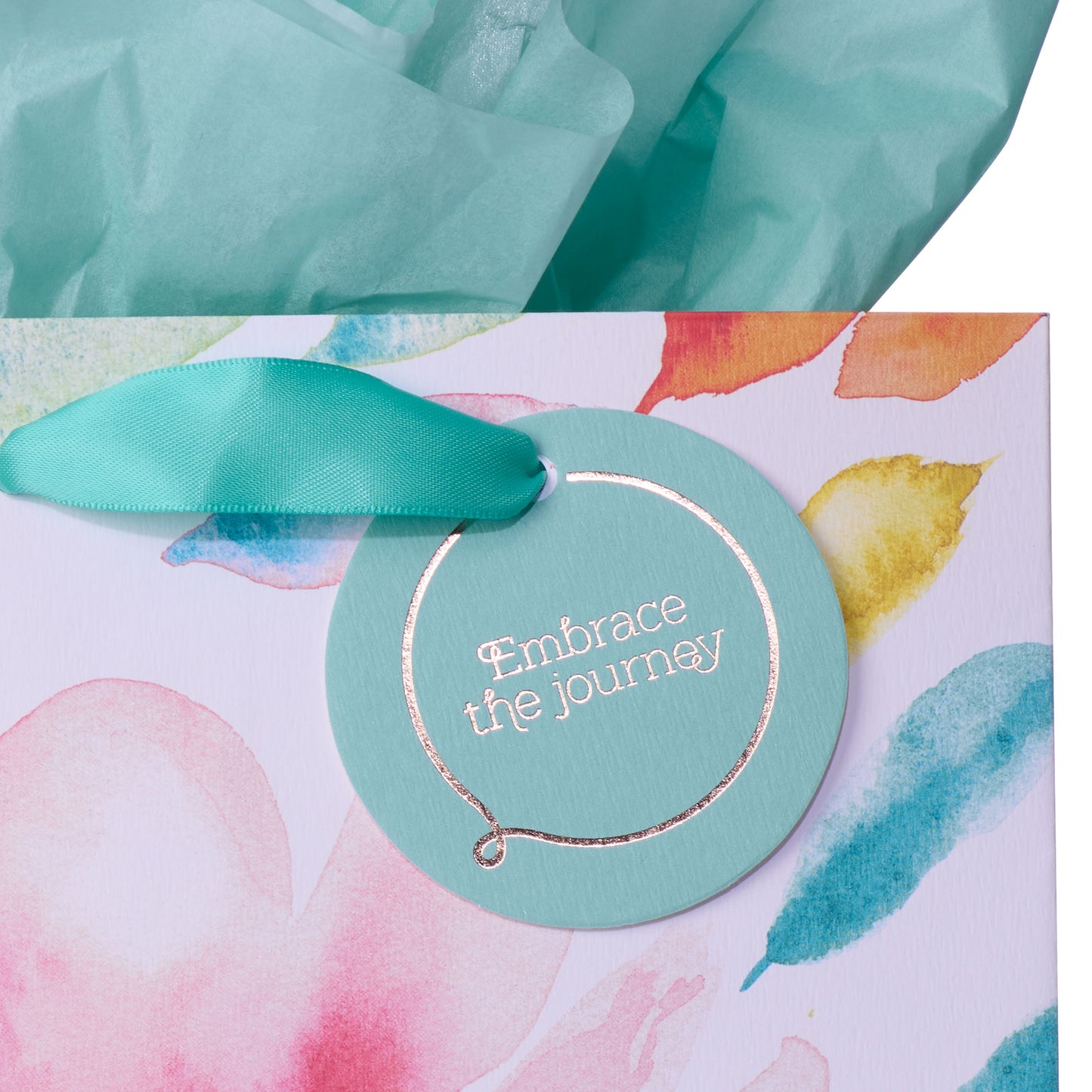 Two sheets of pastel aqua tissue paper and aqua satin ribbon handles lend soft color accents to match the elegant florals. To personalize your gift with a note of encouragement, look no further than the attached blue gift tag, which is also gilded with the sentiment.