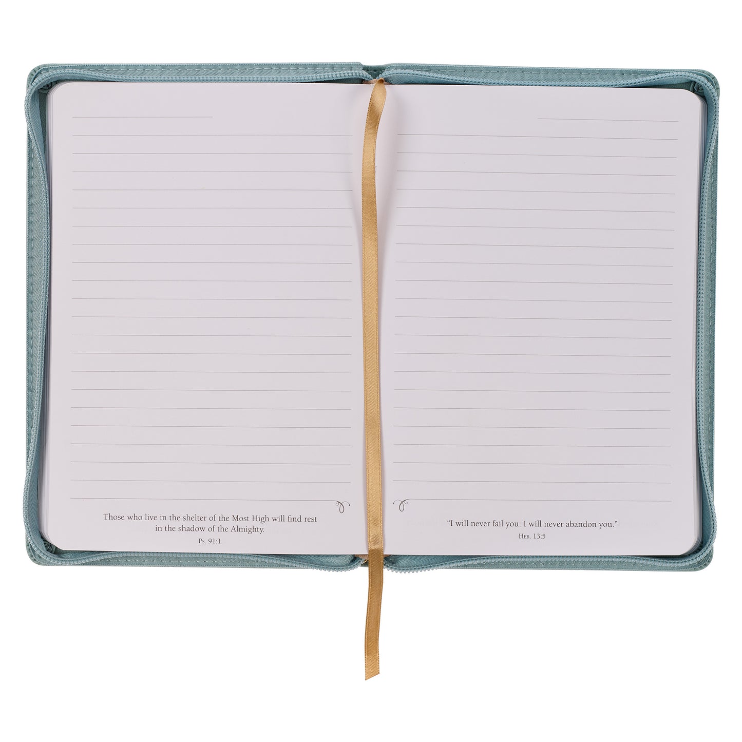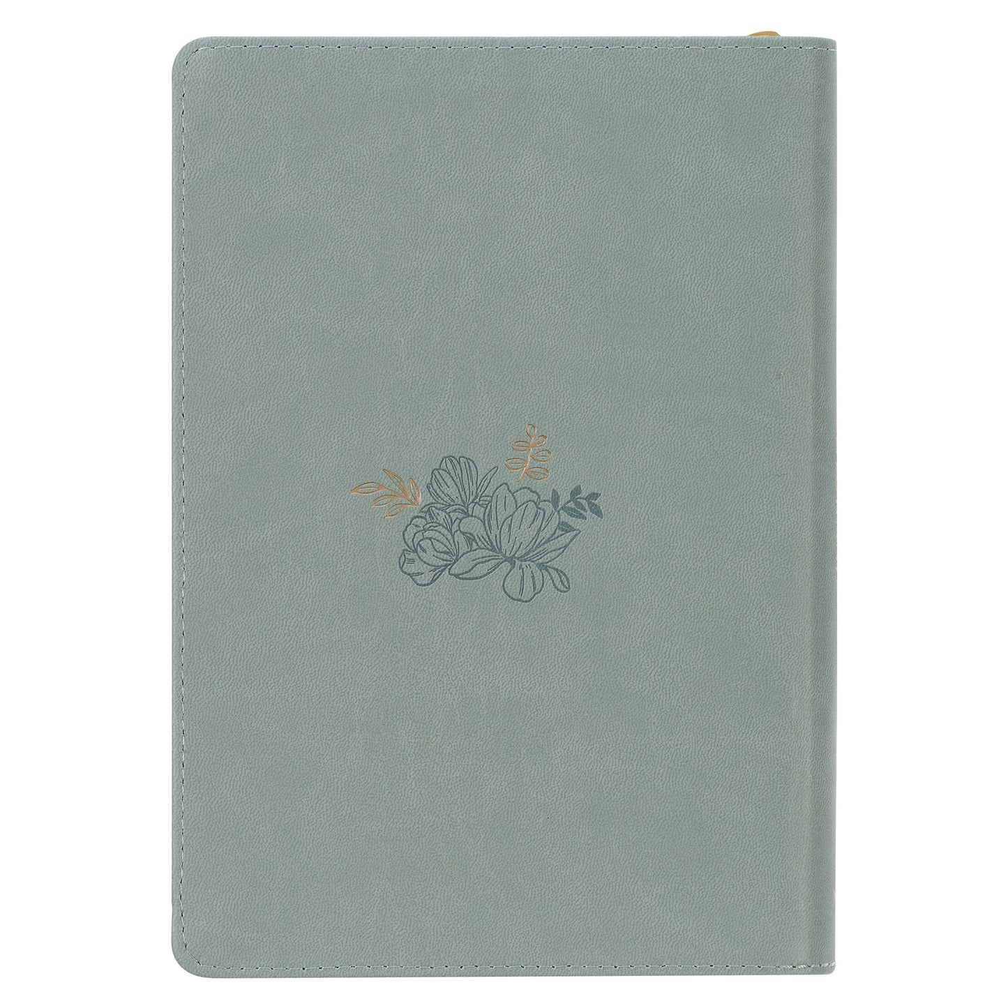 The back cover features a solitary heat-debossed bouquet accented with gold-foiled sprigs. A sturdy teal zippered closure with a gold-toned zipper pull ensures that the journal closes securely. The journal features 336 lined pages. Each page features a Scripture verse at the bottom that can be used as a journal or prayer prompt and a gold satin ribbon marker will mark your page so you can pick up where you have left off.