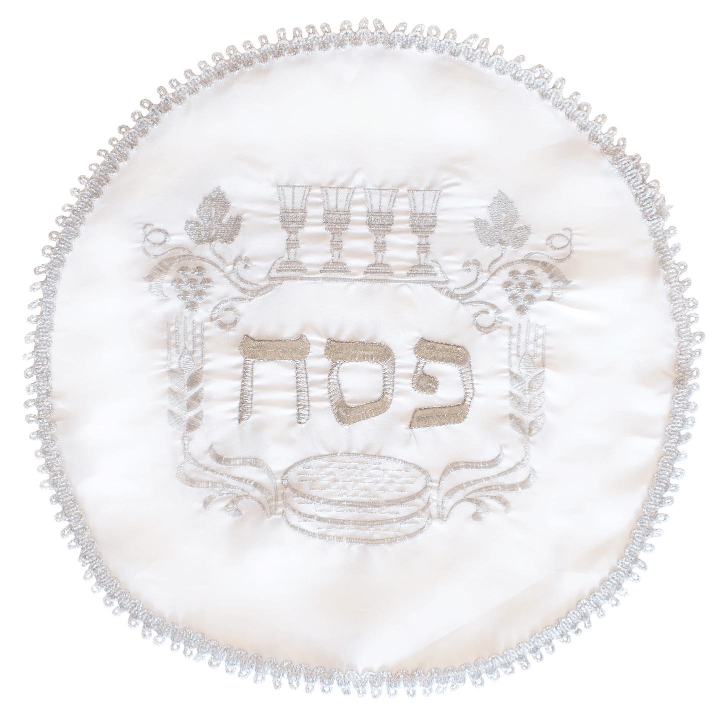 This traditional matzah cover is a beautiful addition to any Passover table. The cover is made of white polyester, with silver-colored tassels on its outer rim. It has embroidered in Hebrew the word פסח - Pesach (Passover) in the center of the matzah cover in gorgeous silver lettering along with the four cups on top and the three matzot on the bottom. With an intricate design incorporating wheat on either side, above it is the same design incorporating grapes and their vines. The Matzah cover has three sections inside to separate the three Matzohs.