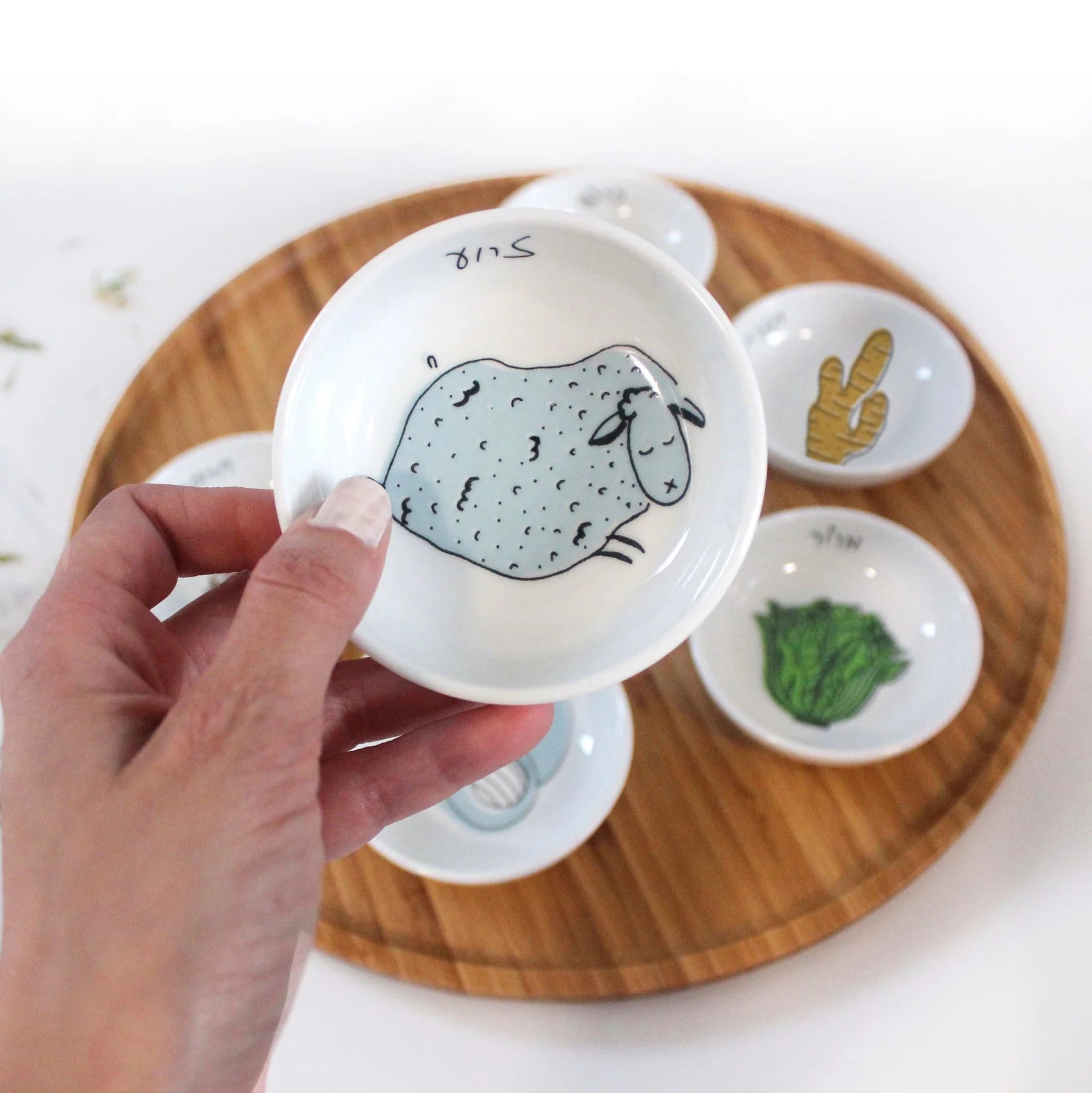 The seder plate design with a combination of wood and ceramics was something I always dreamed of creating. Finally, I had the courage to try it out and prepare this modern Passover Plate and ceramic bowl set. I love the way these two materials combine beautifully to create this set.