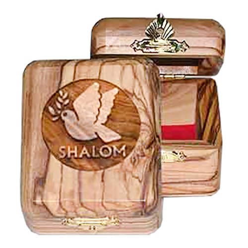This olive wood box is engraved with the image of a dove and Shalom (Hebrew for peace).