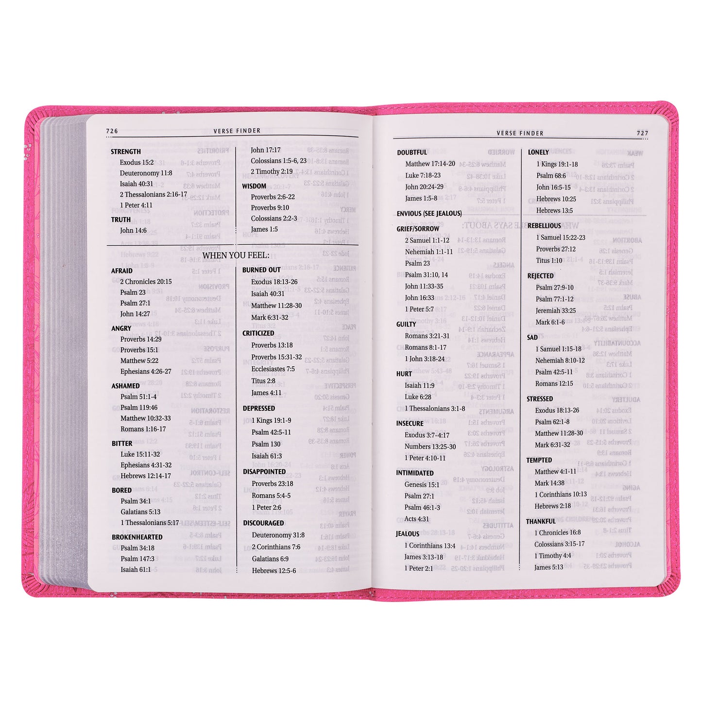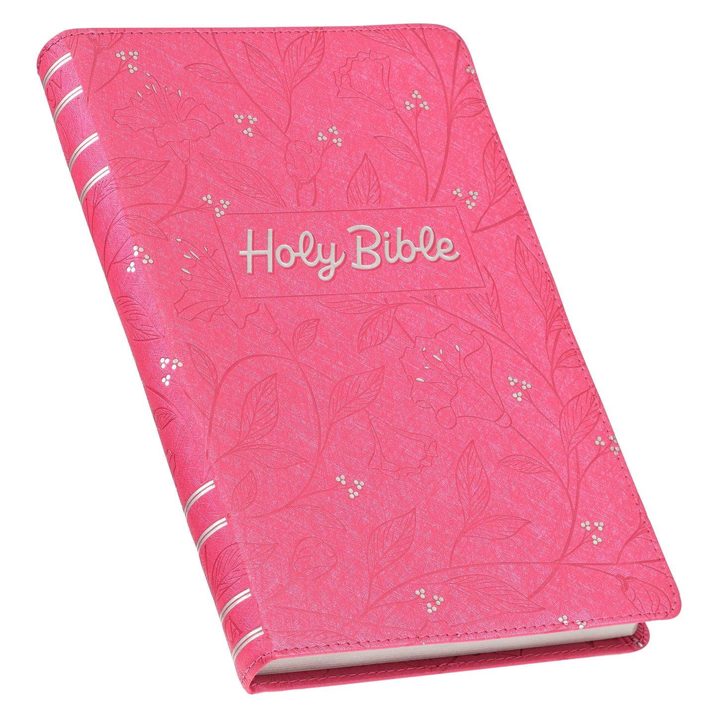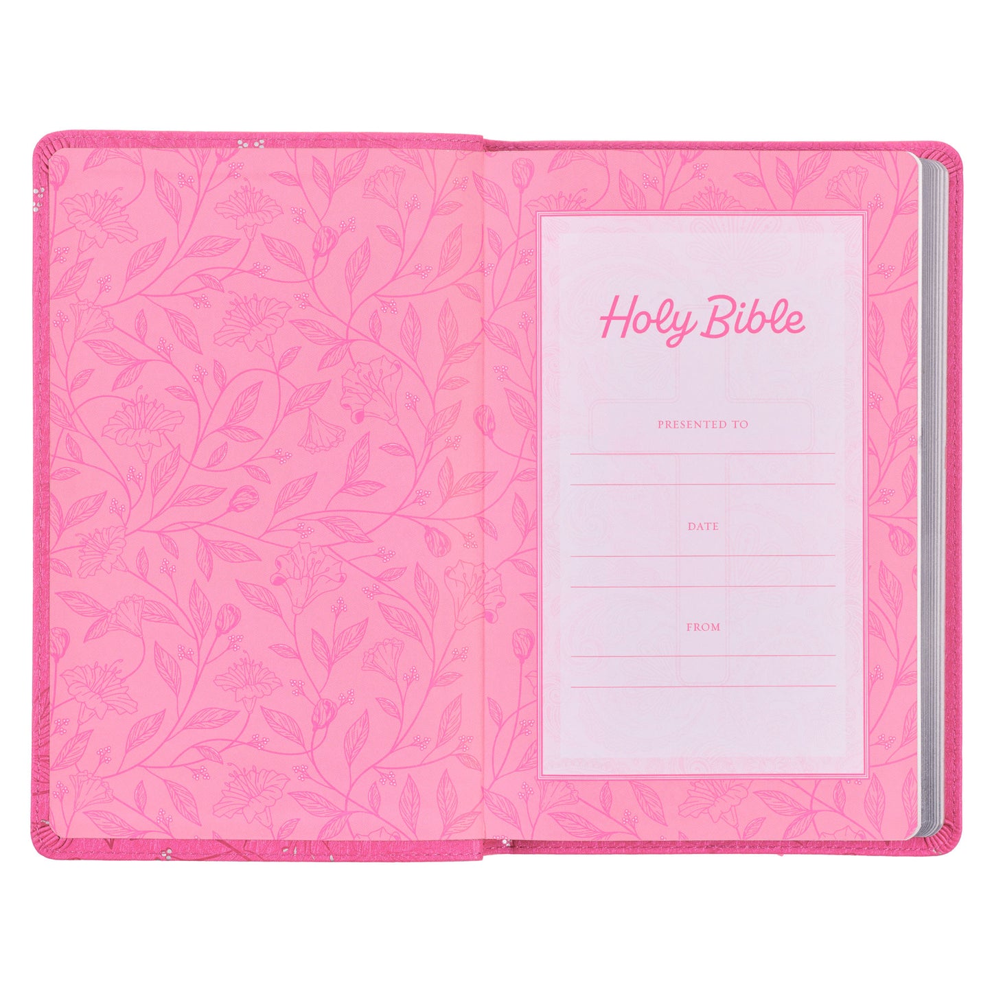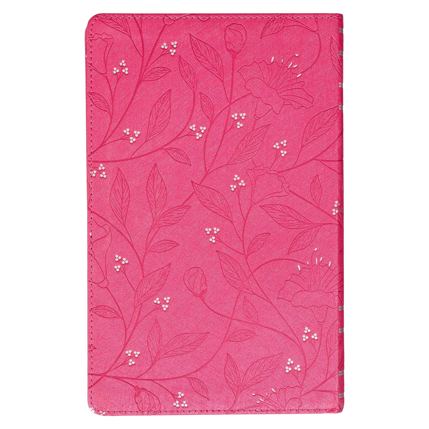 The pretty silver sprayed page edges not only lend an elegant touch to the design but also provide protection against dust and moisture, ensuring the longevity of the pages. Additionally, cherry pink topstitching along the edges of the cover enhances the strength and durability of this Bible. The Bible is protected by a full-color printed cardboard sleeve.