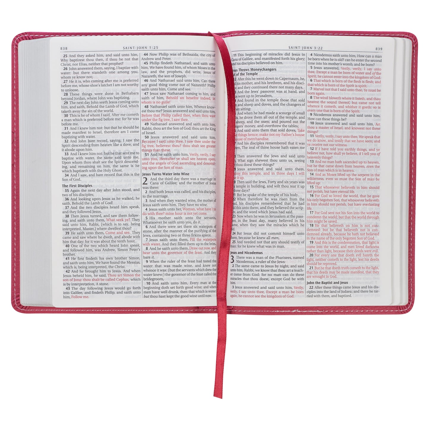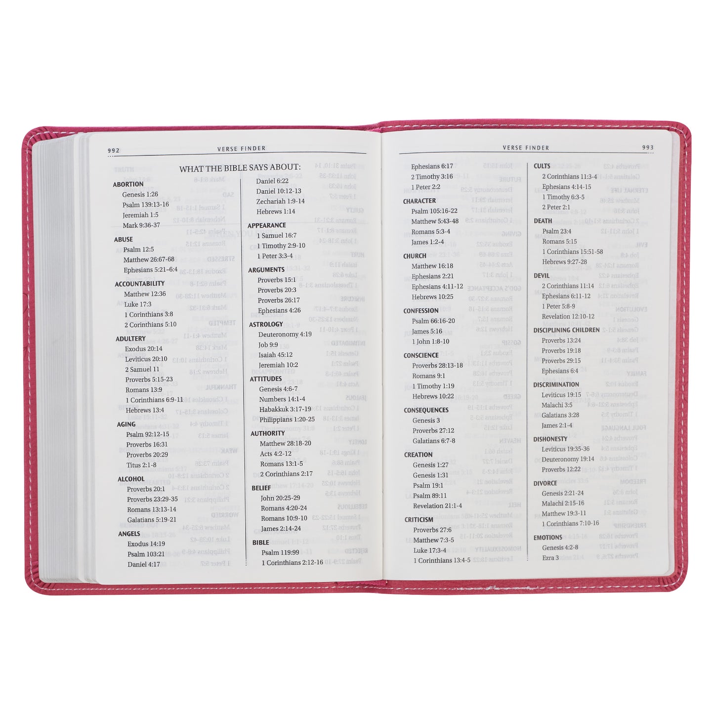 The sweet design of the Pink Faux Leather Compact King James Version Bible will charm women of all ages, as will the poetic text of the King James Version in which it is written.