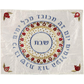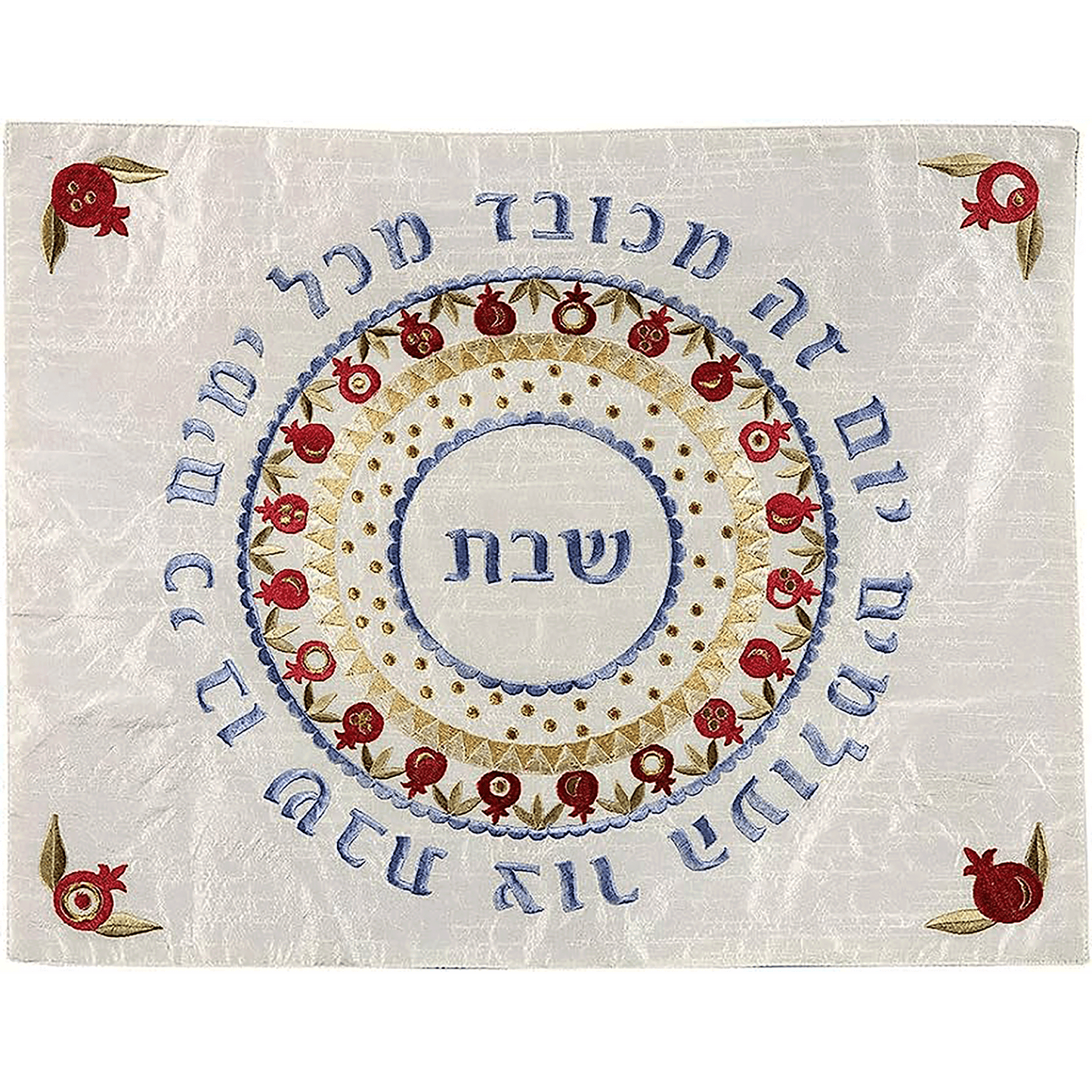 This beautiful challah cover features a circle design with the word "Shabbat" surrounded by various circles including a circle of pomegranates. On most outer ring has the Hebrew words: