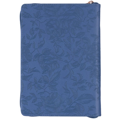 Blue topstitching along the outer edges of the cover enhances the journal's durability. A satin ribbon marker attached to the spine aids in keeping track of your writing progress. A blue zipper with a rose gold metal closure also ensures that the interior pages remain protected.