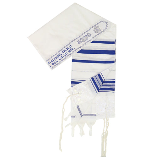 High-quality acrylan (acrylic) fabric with a feel of quality wool. The prayer shawl is white with shades of blue stripes combined with subtle silver tints. The prayer shawl corners are decorated in blue-silver shades and have a matching neckband (atara) at the top that is decorated with the traditional blessing.
