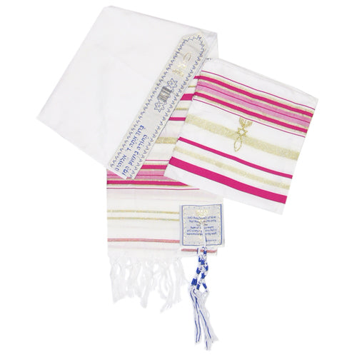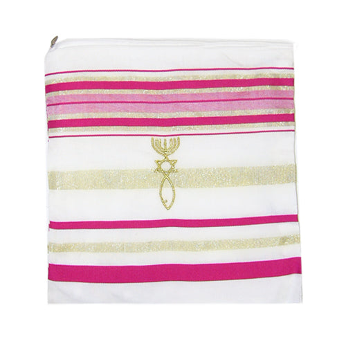Crafted in soft, high-quality acrylic, this white prayer shawl features elegant pink and metallic gold stripes and includes matching zippered bag with embroidered Grafted-In symbol on it. The collar is adorned with the Grafted-In symbol, a powerful emblem of unity in faith, and inscribed in Hebrew with the blessing: