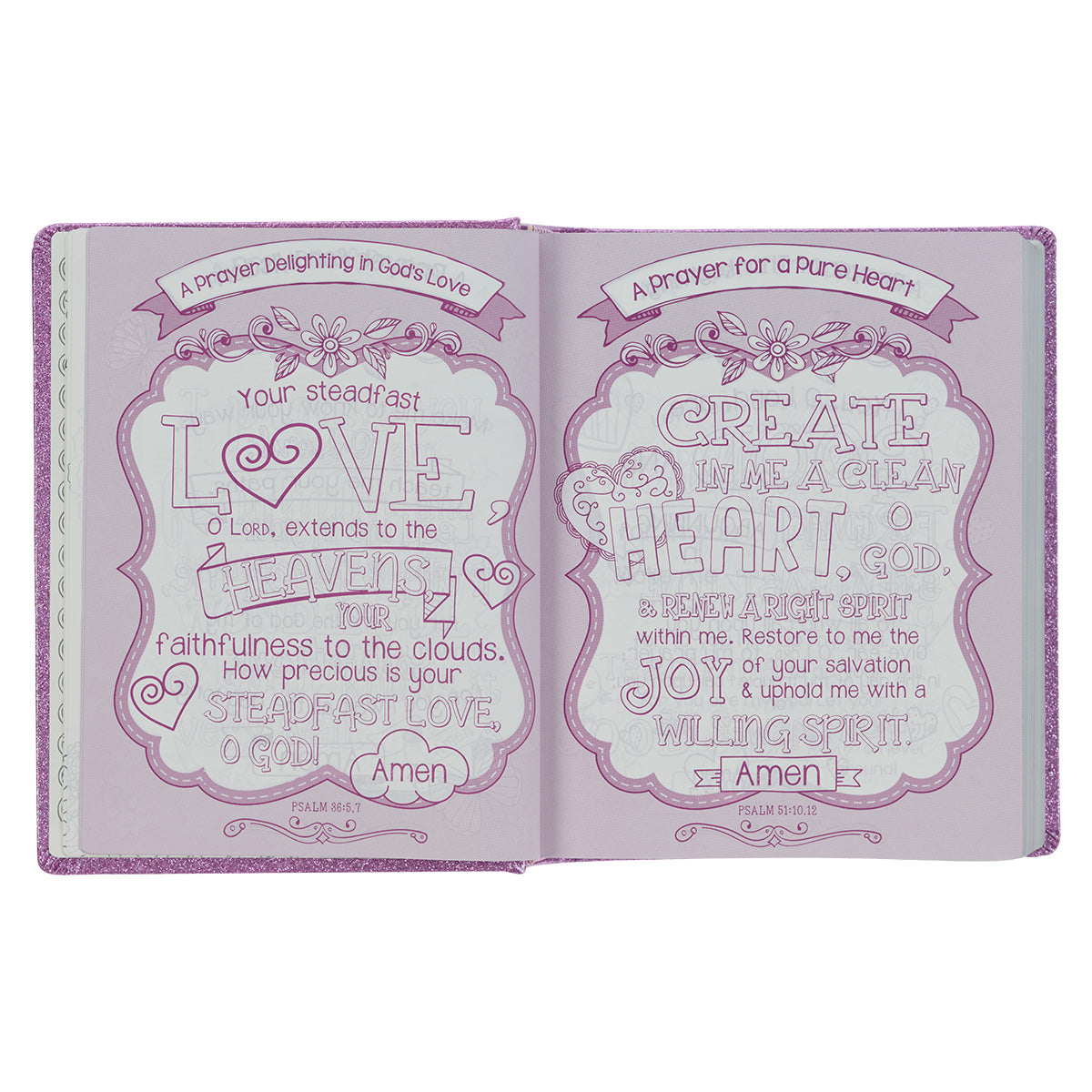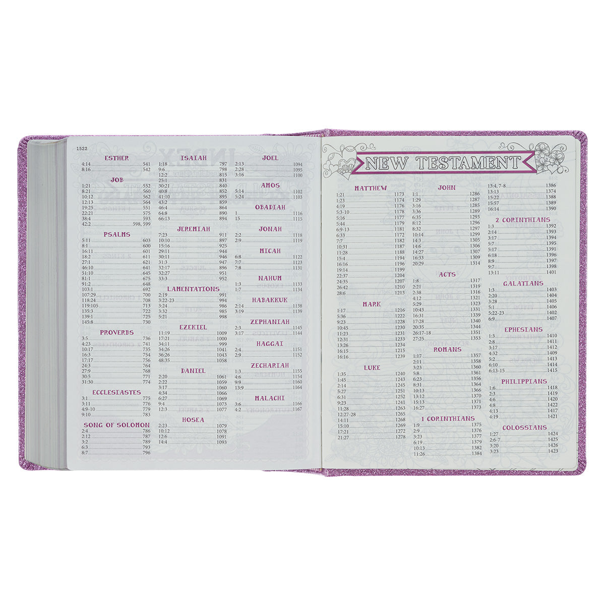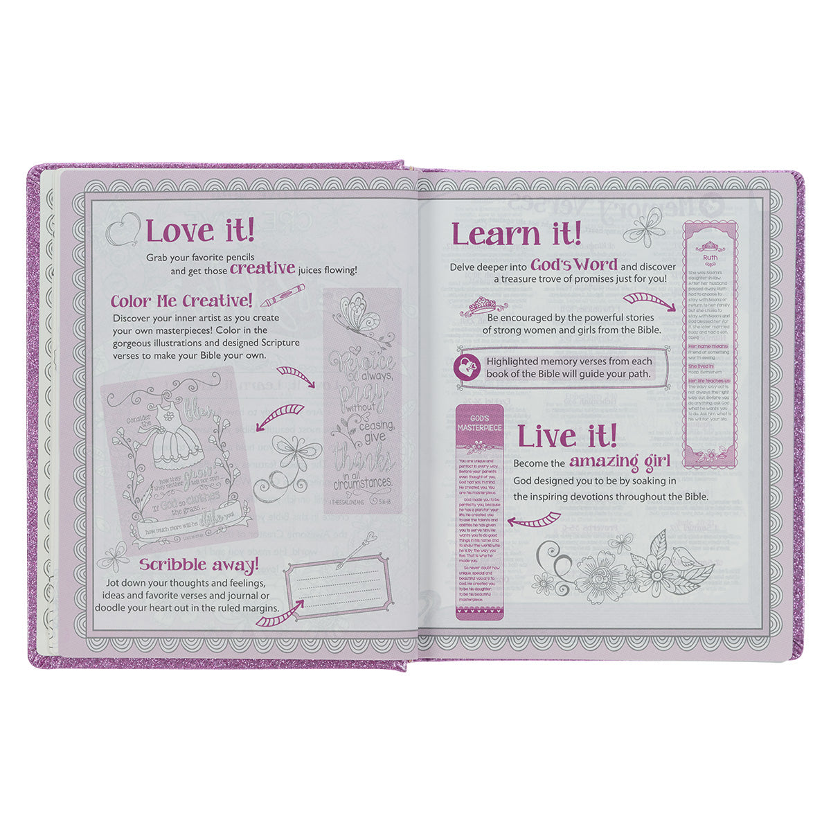 The Purple Glitter Hardcover My Creative Bible for Girls will inspire young ladies to delve deeper into the Word of God through devotions and Scripture. Help your daughter, granddaughter, niece, or princess find her worth in the Word of God.