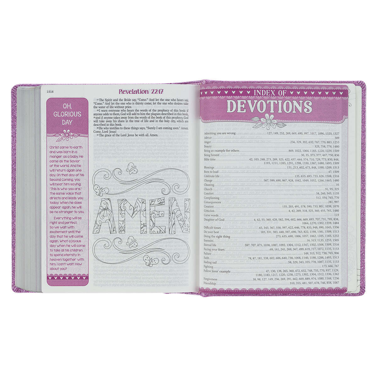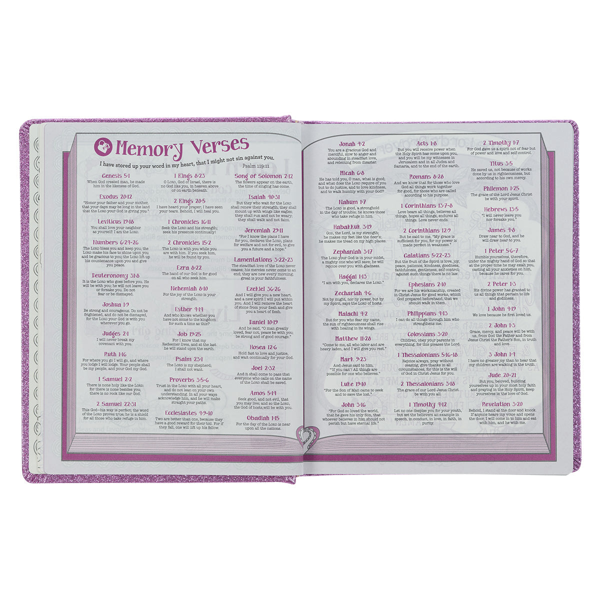 The Bile features two content lists: one lists the books of the Bible in chronological order, and the second lists the books alphabetically. A Bible Memory section includes 66 well-loved Bible verses that every Believer should know and 12 line drawing prayers that will help young girls learn to pray about everything, are ready to be colored and memorized. A line drawing illustration introduces each book of the Bible, and the content that follows is accented with pink banners and highlighted text. 366 devotions set in the margins offer inspiring messages to help girls apply biblical truth to their lives. Inspirational stories of 50 memorable women characters in the Bible will motivate girls to pursue a life of faithfully following God.