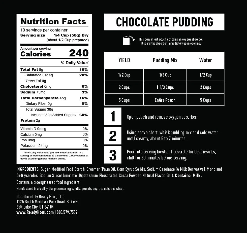 Ready Hour requires no Refrigeration, no need to worry about not having electricity and food spoiling. Ready Hour Chocolate Pudding is perfect when you need a dessert and don’t have a lot of ingredients on hand. Delicious chocolate your family will love!