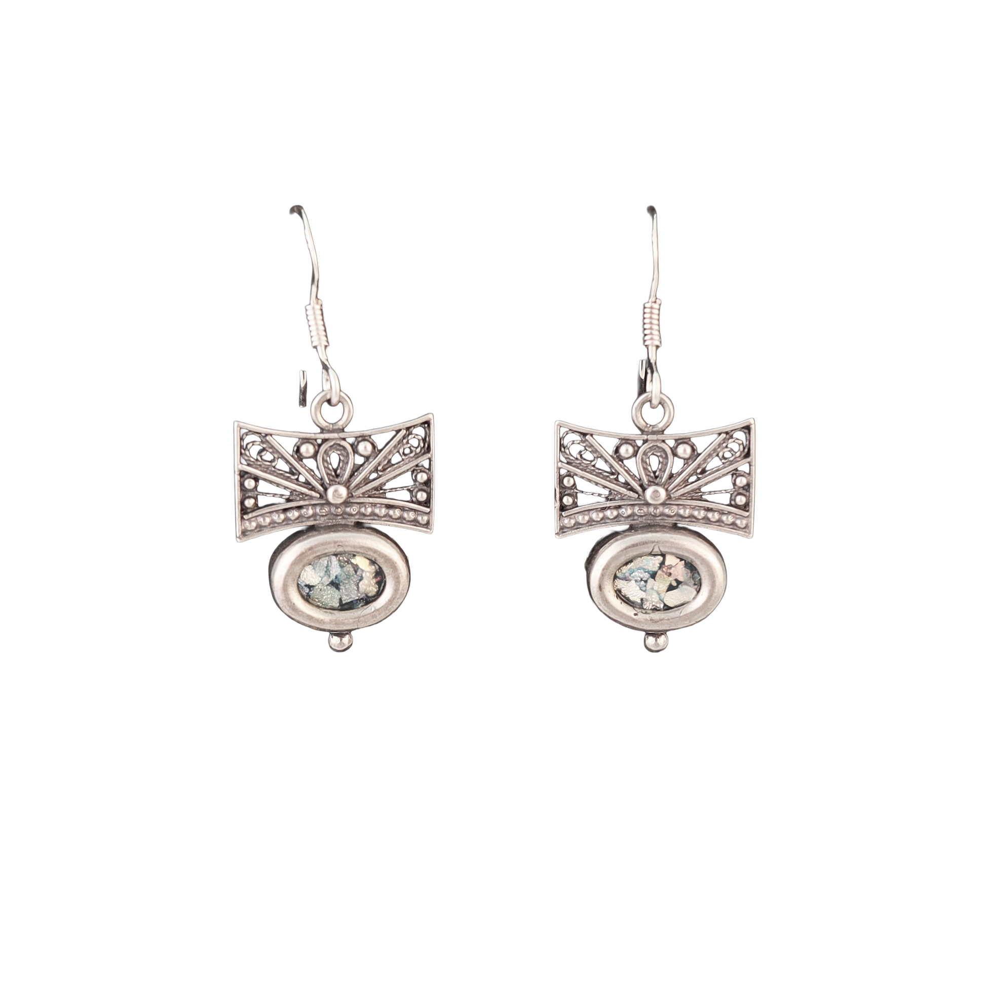 Elegant earrings featuring authentic Roman glass set in intricate silver filigree frames. Each piece showcases the unique color and texture of the ancient glass, making every pair one of a kind. Timeless, distinctive, and perfect for everyday wear or special occasions.