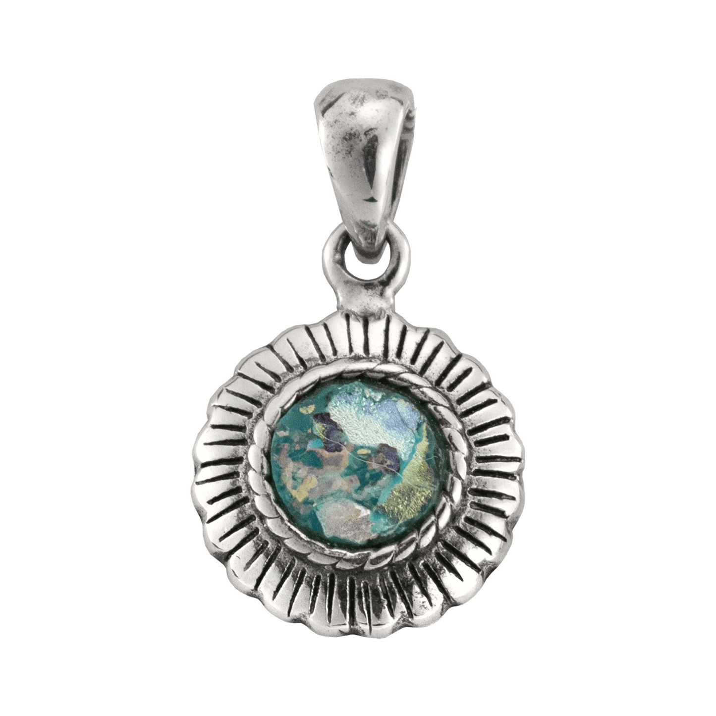 Stunning in its simplicity, this gorgeous necklace will make a wonderful gift to someone you love. A sparkling circle of glittering Roman glass shards in a dazzling array of iridescent hues is framed by a simple silver pendant with a twisted silver band at its center. Beautiful and elegant, it will make a truly special gift for yourself or someone special.