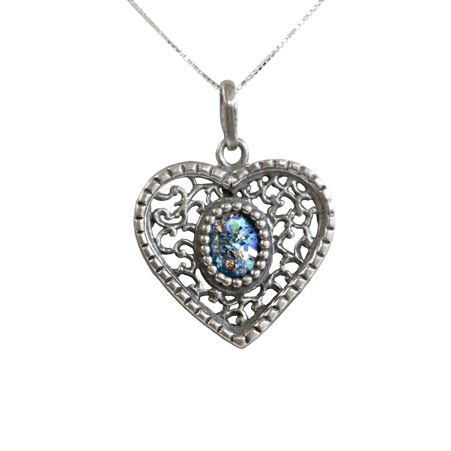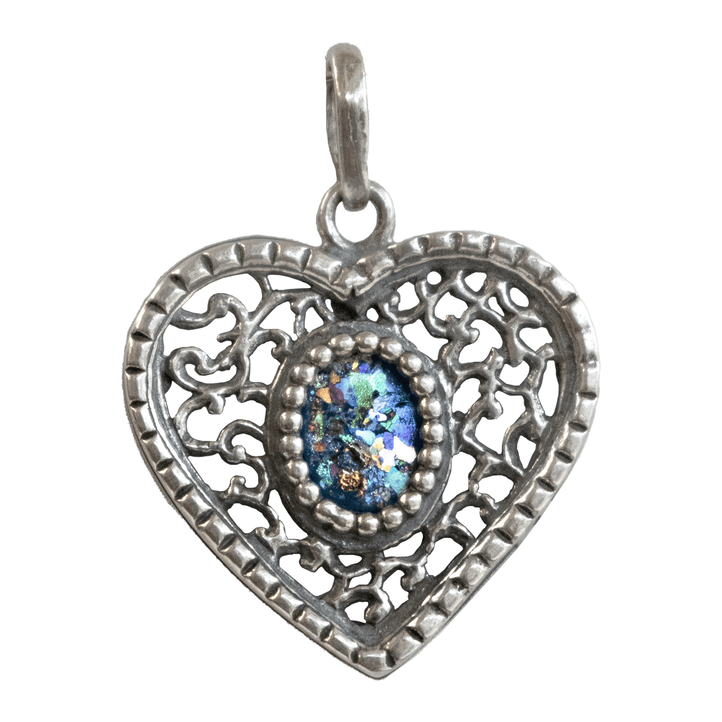 This sterling silver heart pendant is a symbol of love and history. Crafted with an intricate open-cut design, this elegant heart pendant features a captivating round piece of Roman glass that dates back to the period of the Great Roman Empire in the 1st century BCE at its center. Ready to be paired with the chain of your choice, this unique piece seamlessly blends timeless romance with ancient allure. Wear a piece of history close to your heart with this sterling silver pendant, where every glance reveals the enchanting beauty of Roman glass.