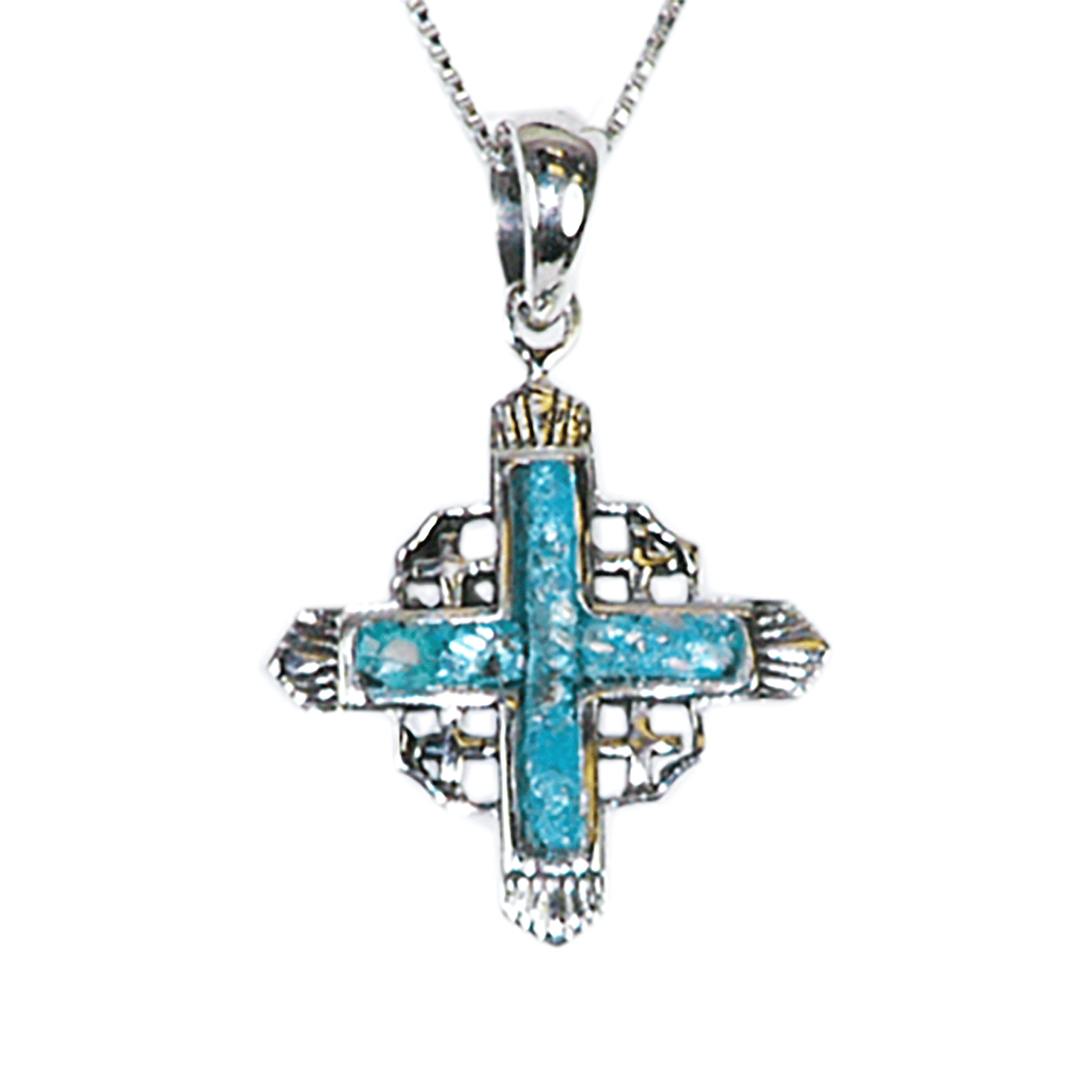 This regal sterling silver Jerusalem Cross pendant is beautiful. Masterfully designed, this piece of eye-catching, iridescent Roman Glass, sparkles giving this amazing work of art a dramatic and radiant pop of color that will brighten up any outfit you wear!