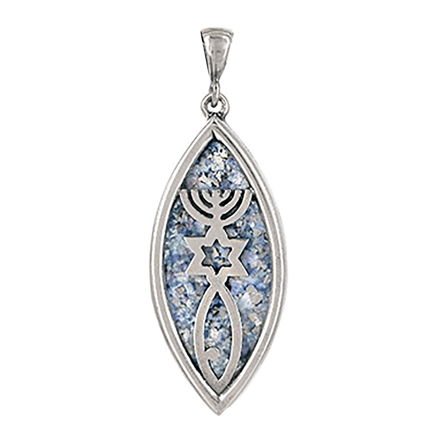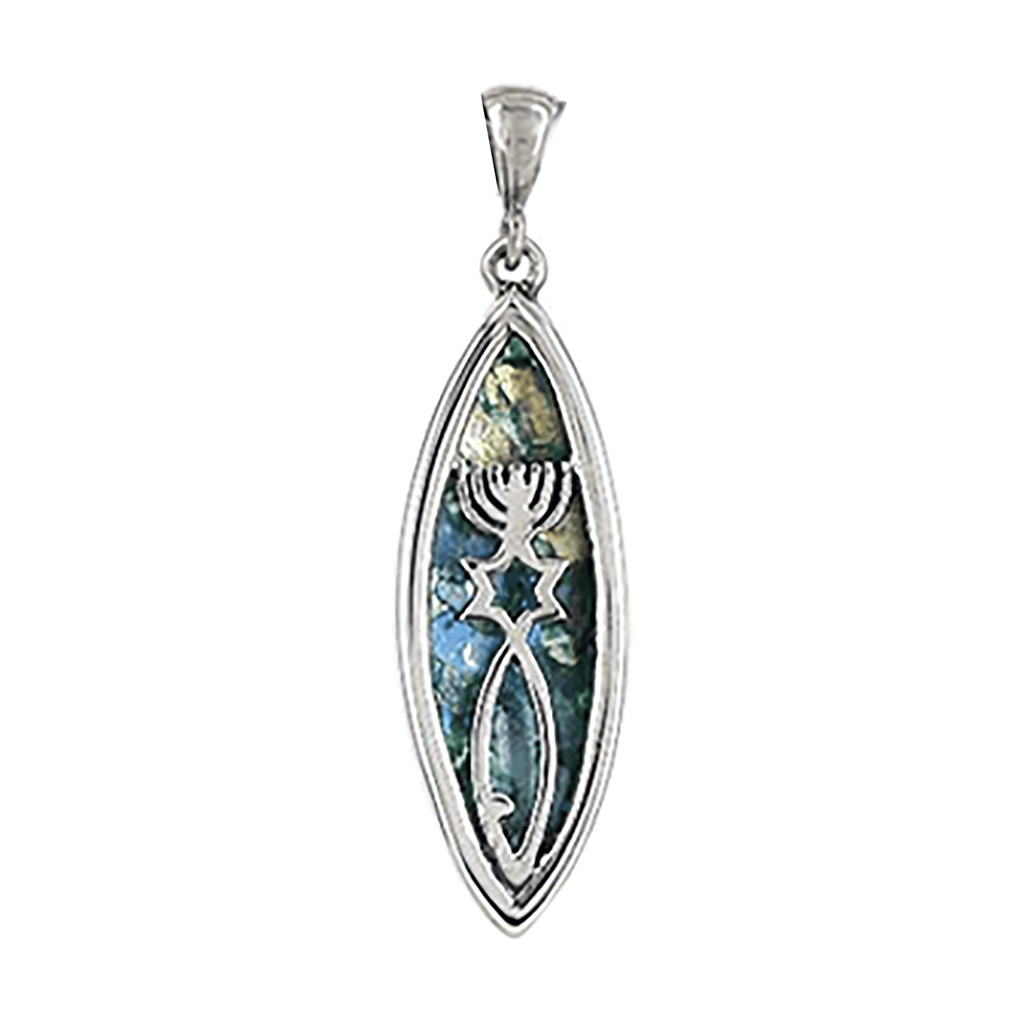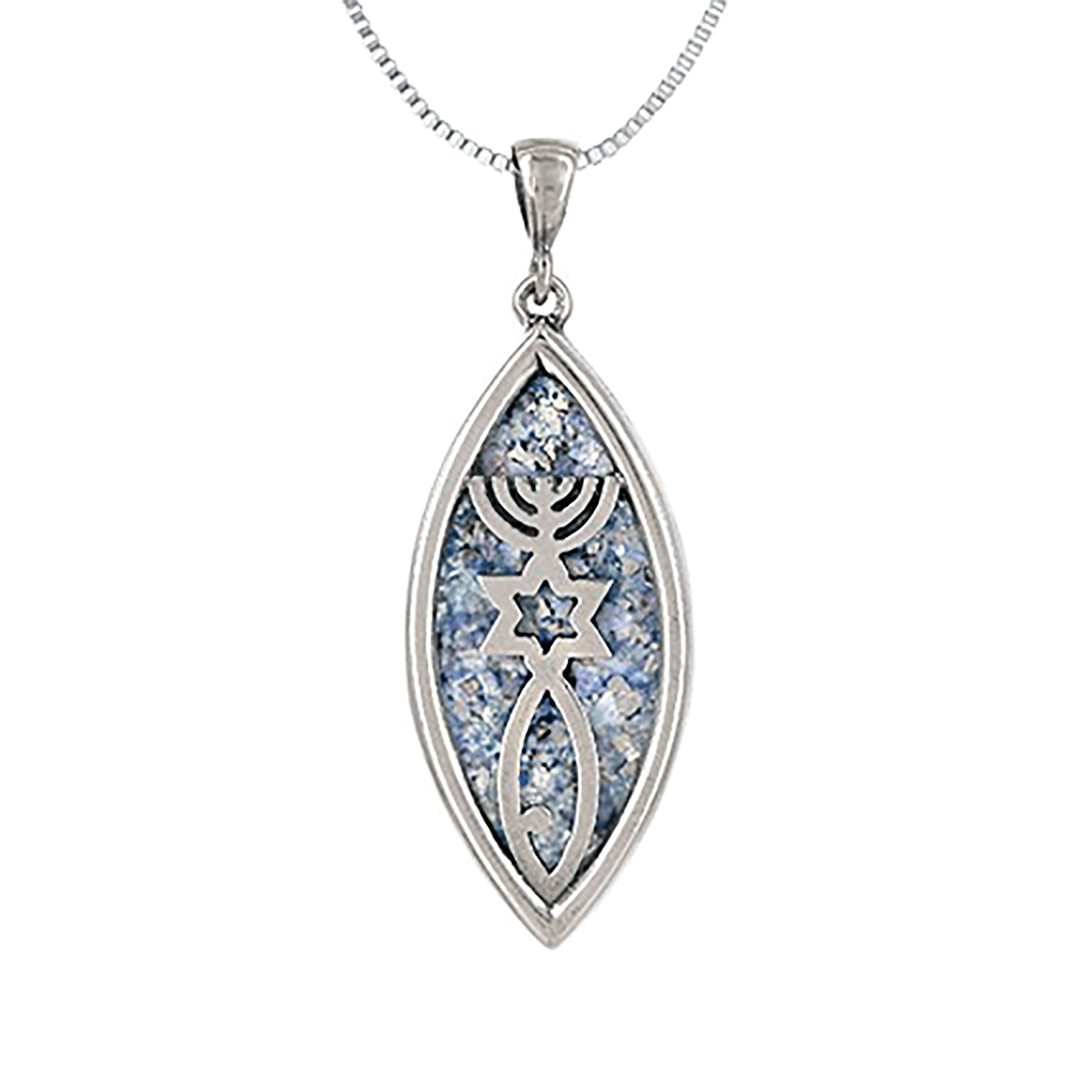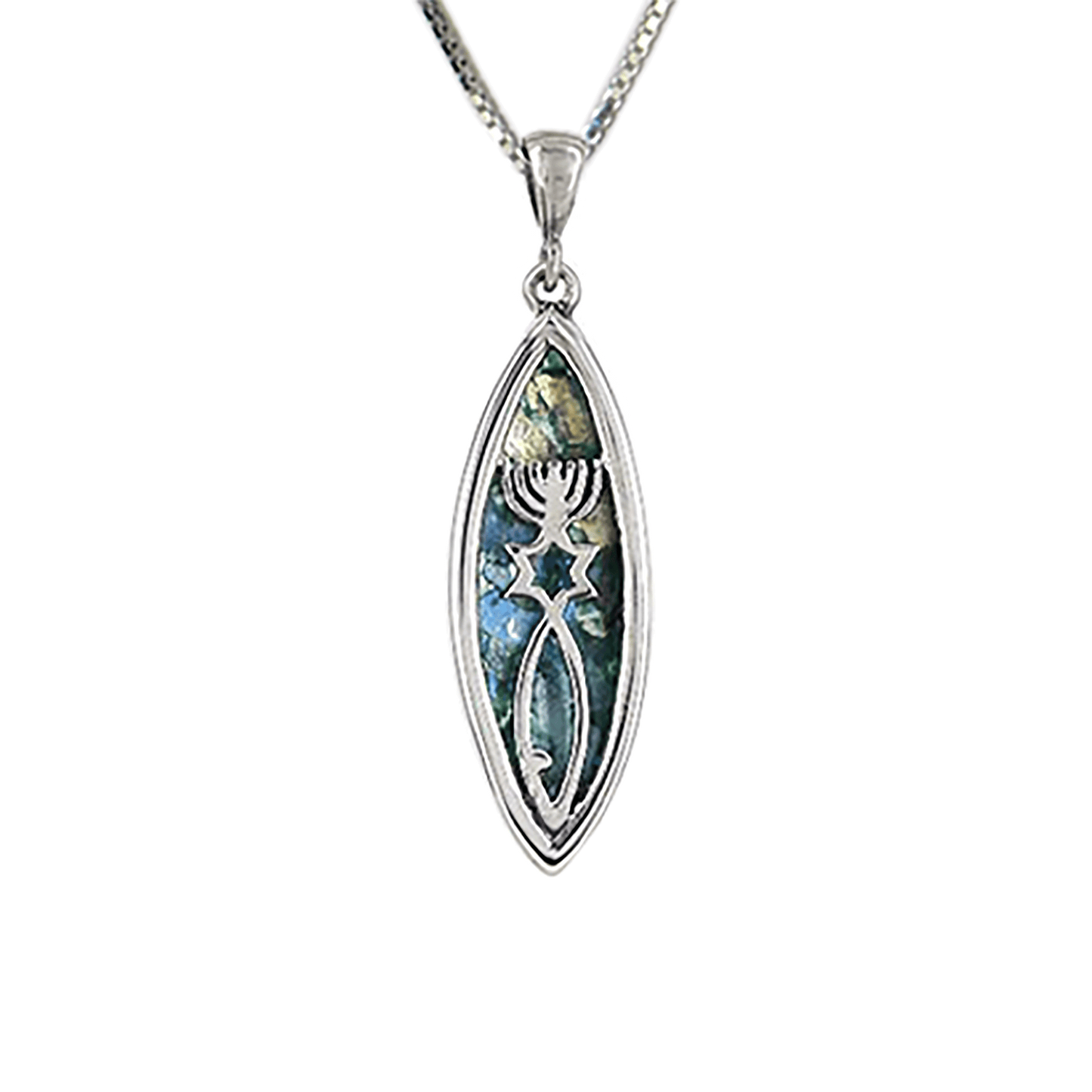 Discover timeless elegance with this marquise-shaped necklace. Encased in a delicate sterling silver frame, the centerpiece of this necklace is a captivating piece of Roman glass, shimmering with ancient beauty. Overlaying the Roman glass is a finely crafted silver 'Grafted-In' symbol, a meaningful representation of unity and heritage. This unique design blends historical allure with contemporary sophistication, making it a perfect accessory for those who cherish both style and significance. Whether for a special occasion or everyday wear, this necklace is a stunning testament to artistry and tradition.