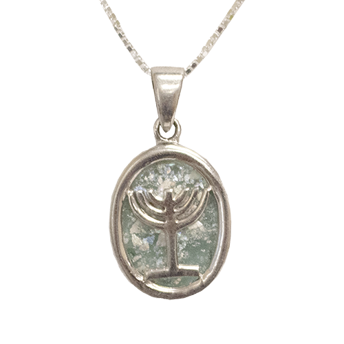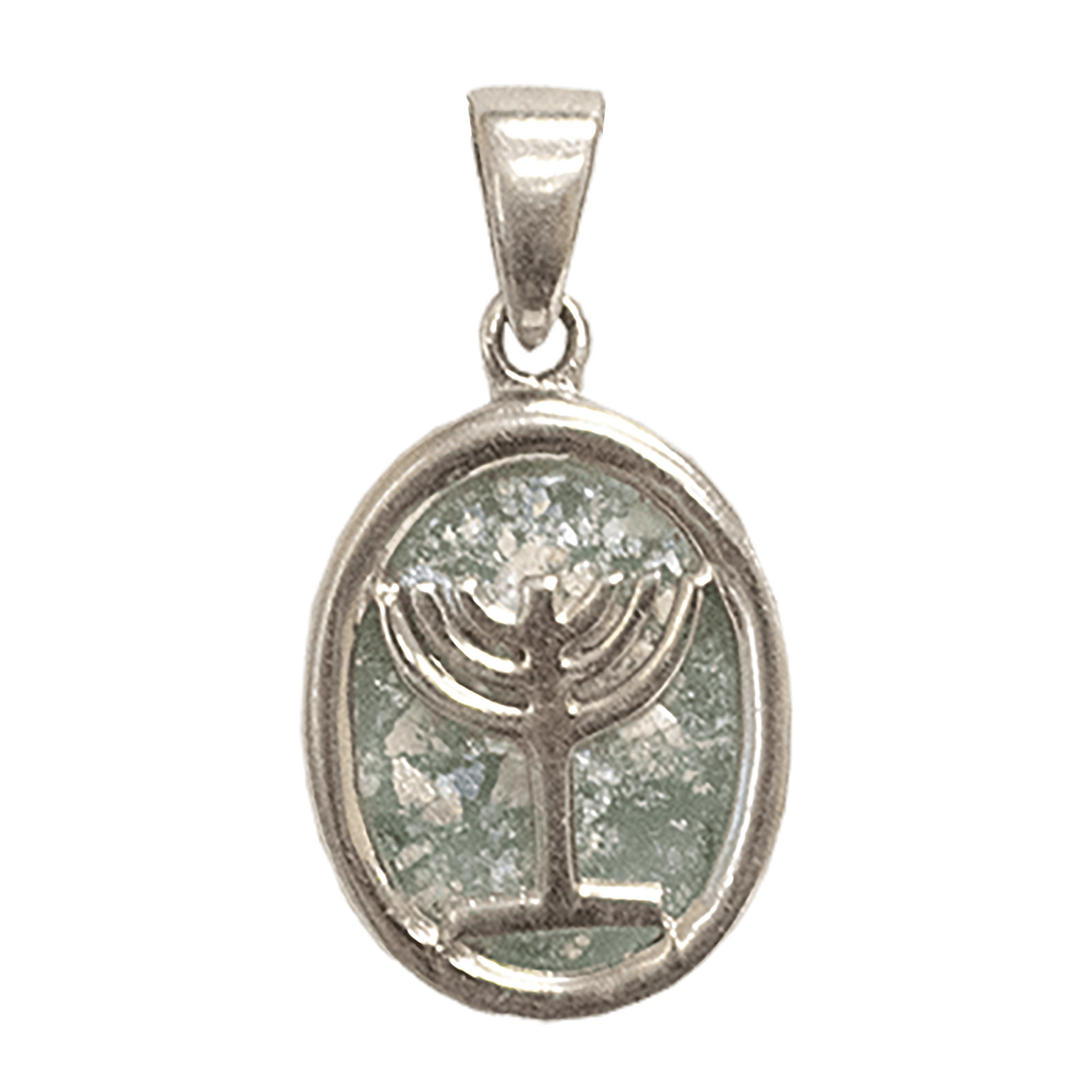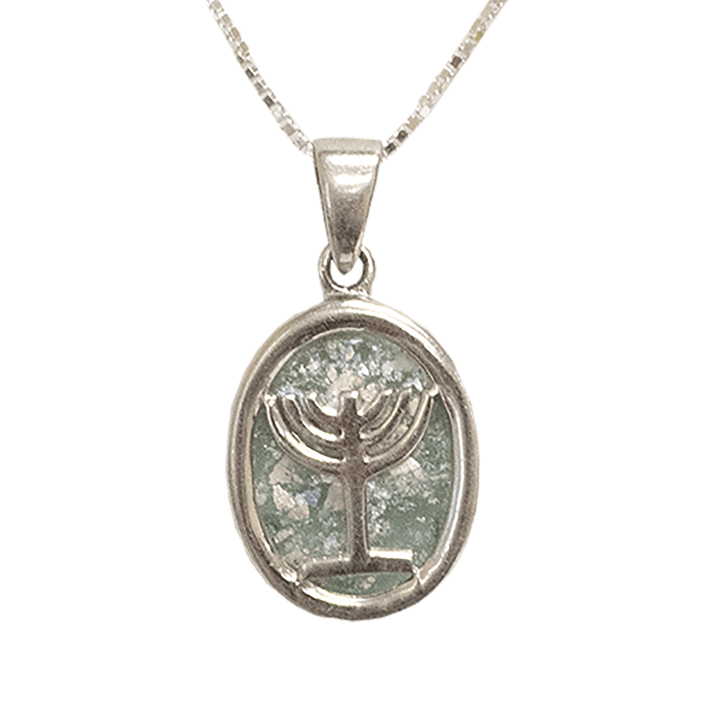 This luxurious silver necklace features a 925 sterling silver menorah set against a beautiful iridescent piece of ancient Roman glass.