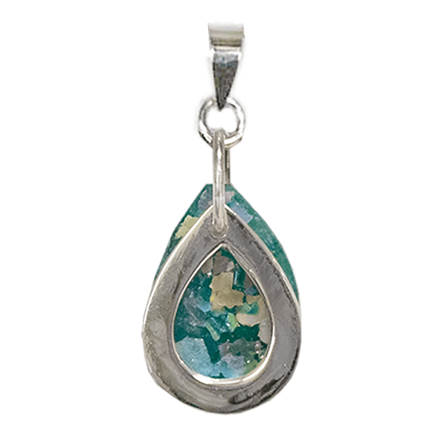 This ancient roman glass necklace blends the glamour and romance of the ancient world with unique beauty shaped by the forces of nature and modern craftsmanship. The roman glass is enhanced by a sterling silver open teardrop that allows the iridescence of the ancient glass to peek through. The result is a wearable piece of history that will accent any fashion.