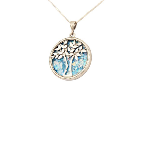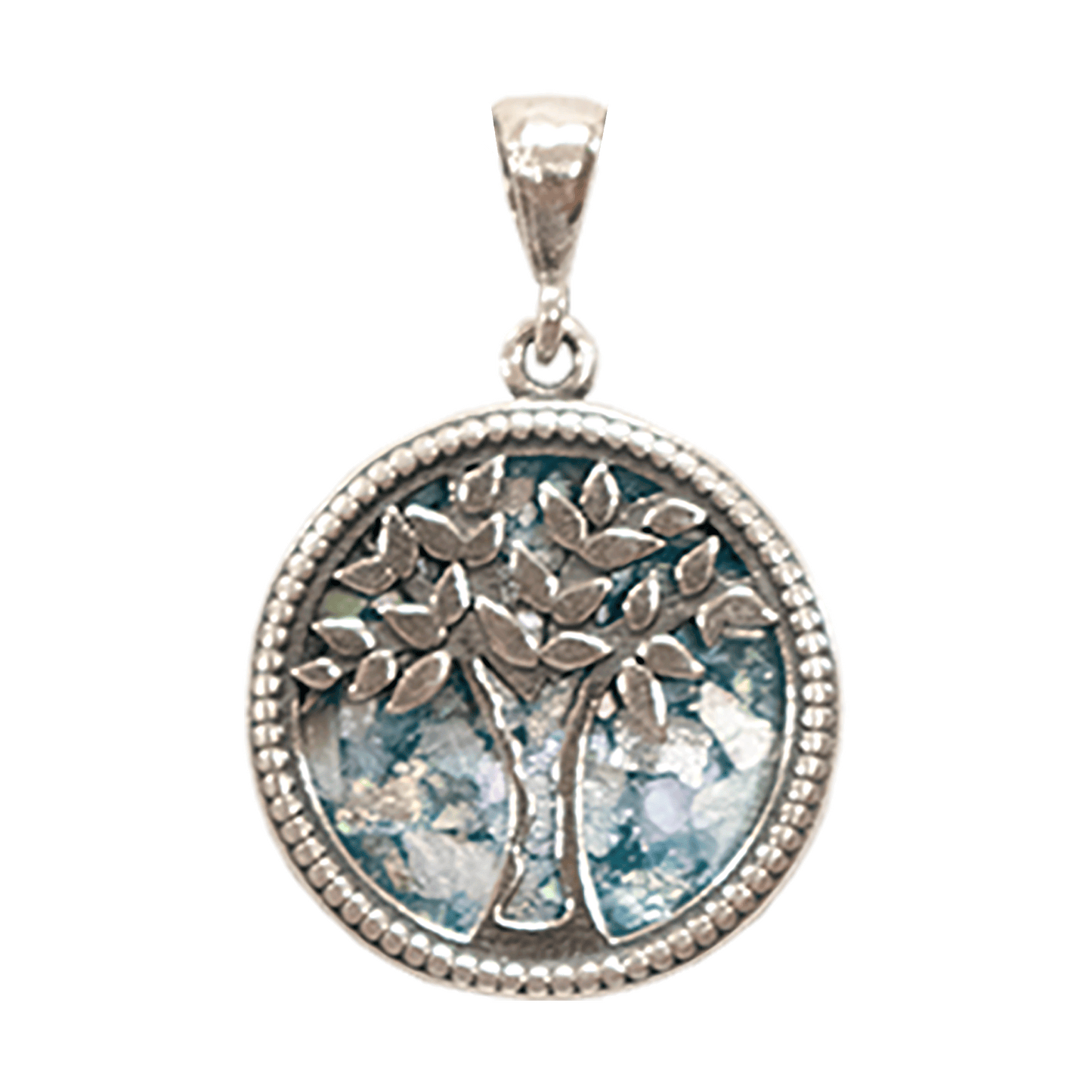 This beautiful tree of life pendant is an open design of sterling silver backed by Roman Glass. The Sterling silver frame is round with an elegant tree of life design that touches the sides of the frame.