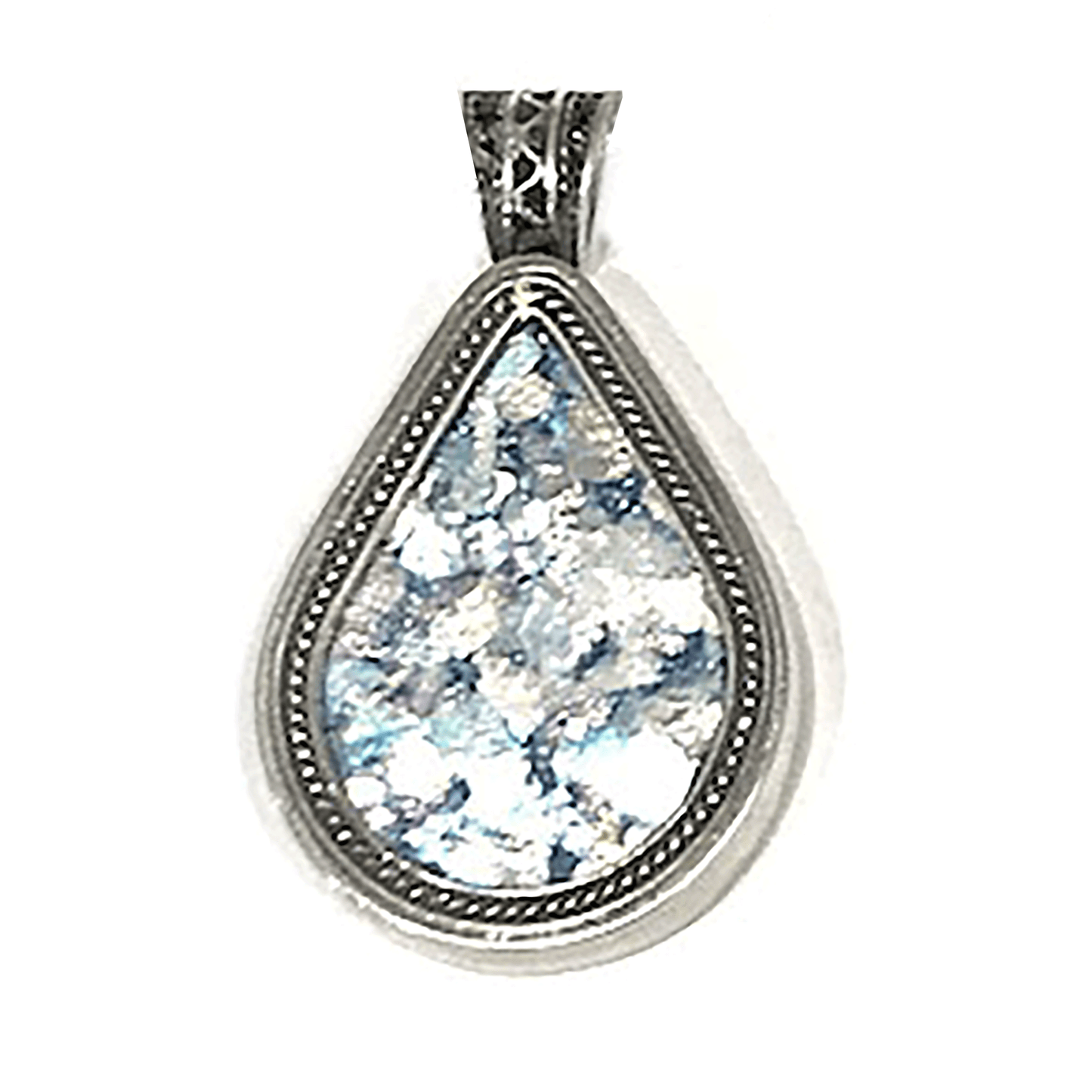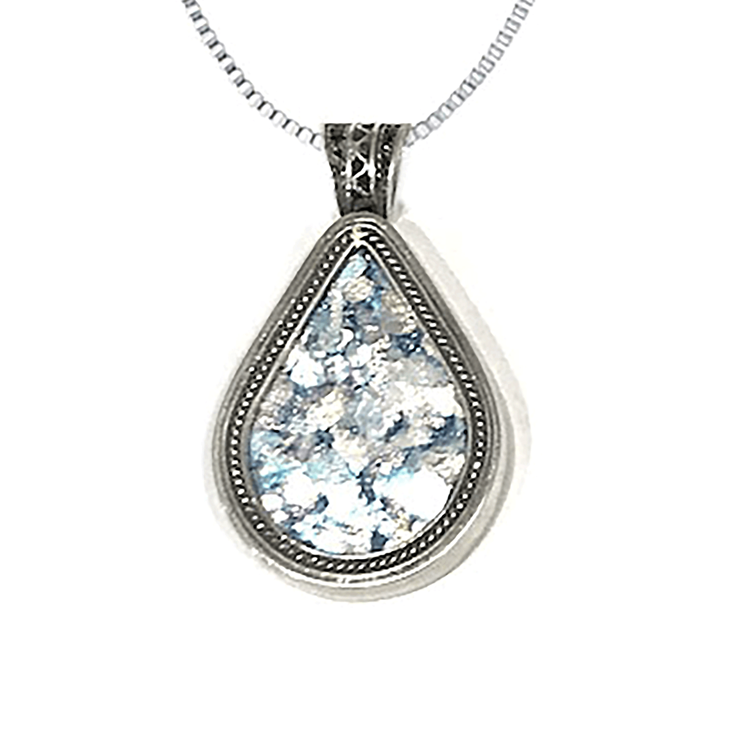 This beautiful necklace features a piece of Roman glass in the shape of a teardrop encased in a border of silver with a filigree overlay. Roman Glass is unmistakably recognized by the luminous colors that can be seen with the naked eye within the glass.