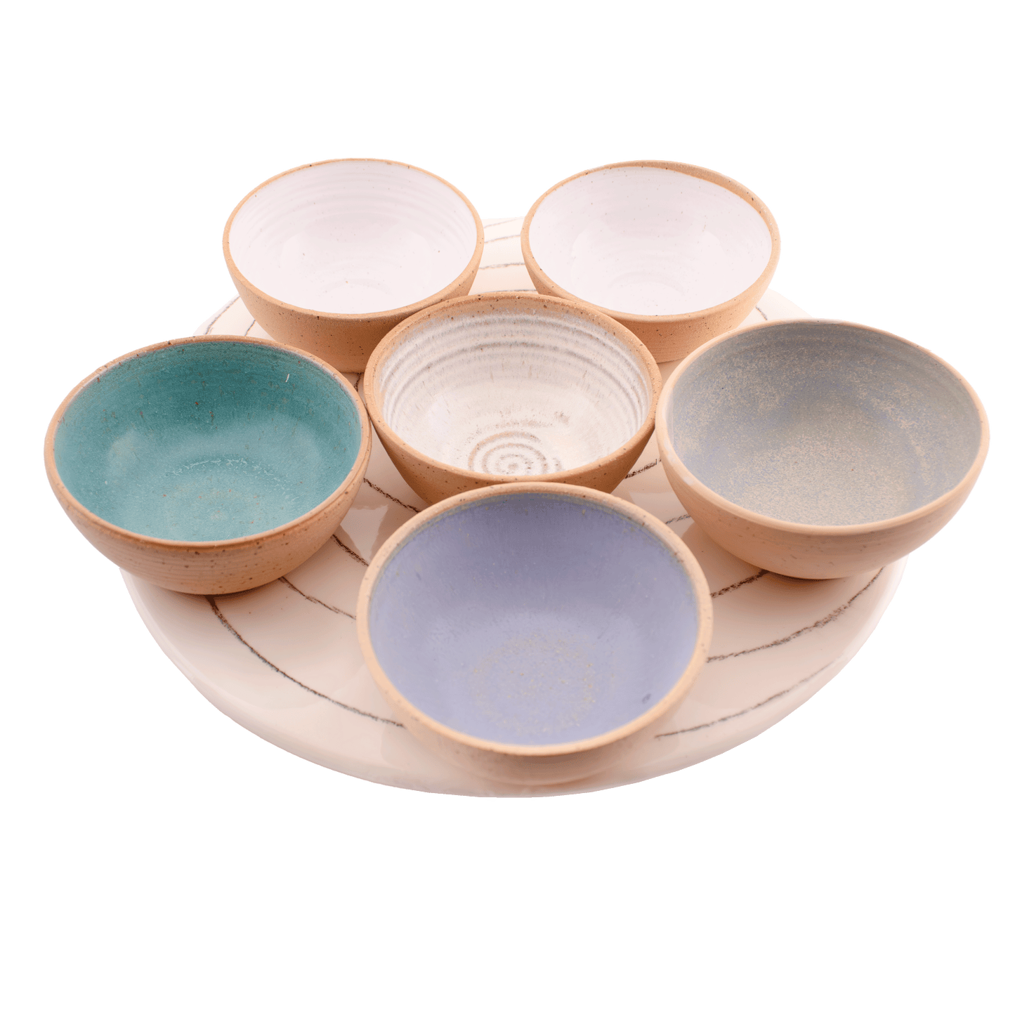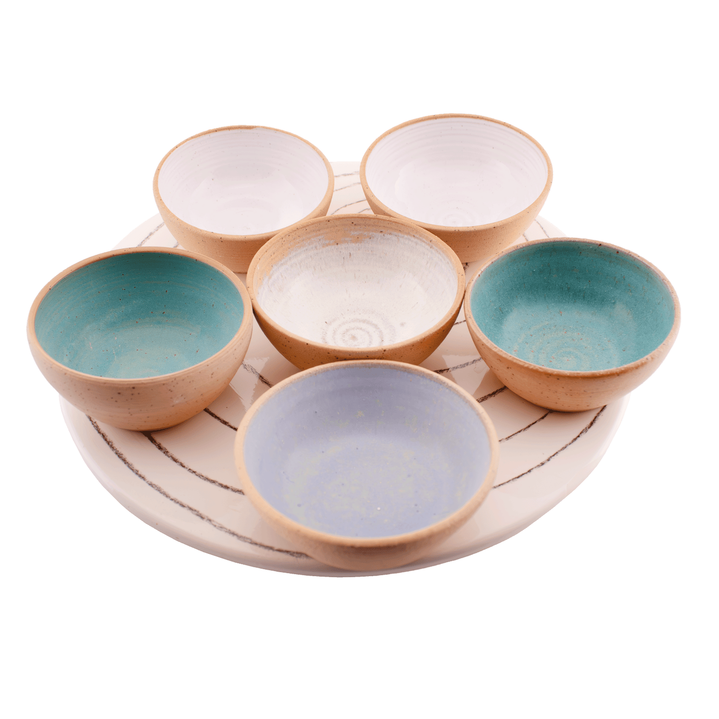 This versatile ceramic serving set features a beautifully crafted serving plate with a captivating swirl design and six coordinating bowls. Each bowl is glazed in a different color, adding a playful and eye-catching touch to your table setting. Perfect for serving snacks, dips, sauces, or a variety of small treats, this set is as functional as it is stylish. Whether entertaining guests or enjoying a casual meal, this serving plate and bowl set offers endless possibilities, making it a delightful and practical addition to your kitchen or dining collection.