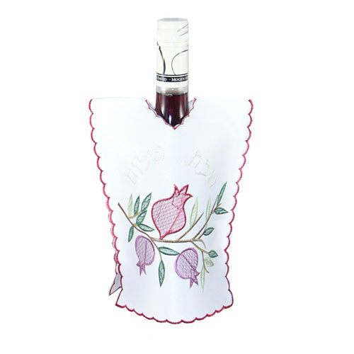 Our elegant wine bottle cover is designed to enhance your dining experience. Crafted in pristine white, this cover showcases a captivating pomegranate branch motif delicately embroidered in natural colors. Adorning the top of the cover, you'll find the Hebrew words "Shabbat Shalom" (Sabbath Peace) intricately stitched in shimmering silver.
