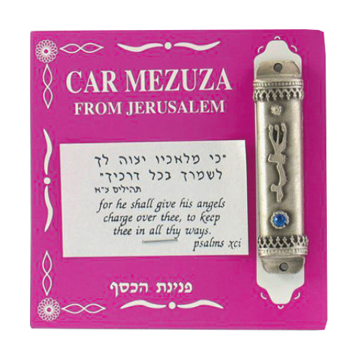 This stylish car mezuzah is a great reminder of the need for Divine protection when driving. Made from silver-plated zamak metal, it features "Shaddai", the Divine Name in bold letters with a decorative blue stone and a decorative design at the top and bottom. On the reverse side, is easy stick-on tape.