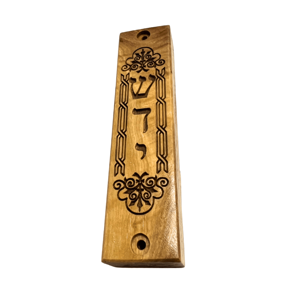 This high-quality olive wood Shaddai mezuzah case is adorned with the Hebrew Word Shaddai and decorative etching around it.