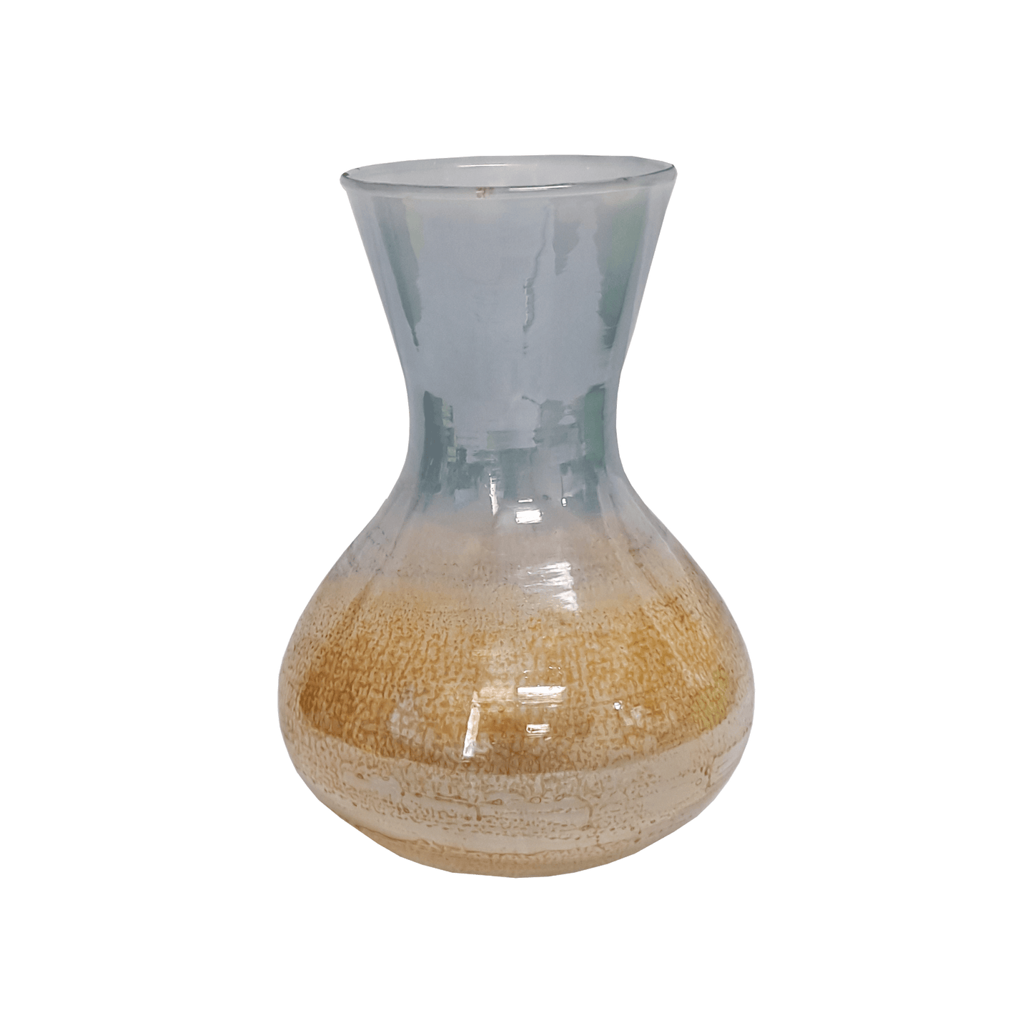 This Simron glass vase is a beautifully handcrafted piece, decorated with colored acid washes to create an iridescent "oil on water" watercolor effect. The surface shimmers with a delicate blend of colors that shift and change in different lighting, giving the vase a captivating and fluid appearance. The unique decoration adds a sense of movement and depth, making this vase a striking artistic addition to any space.