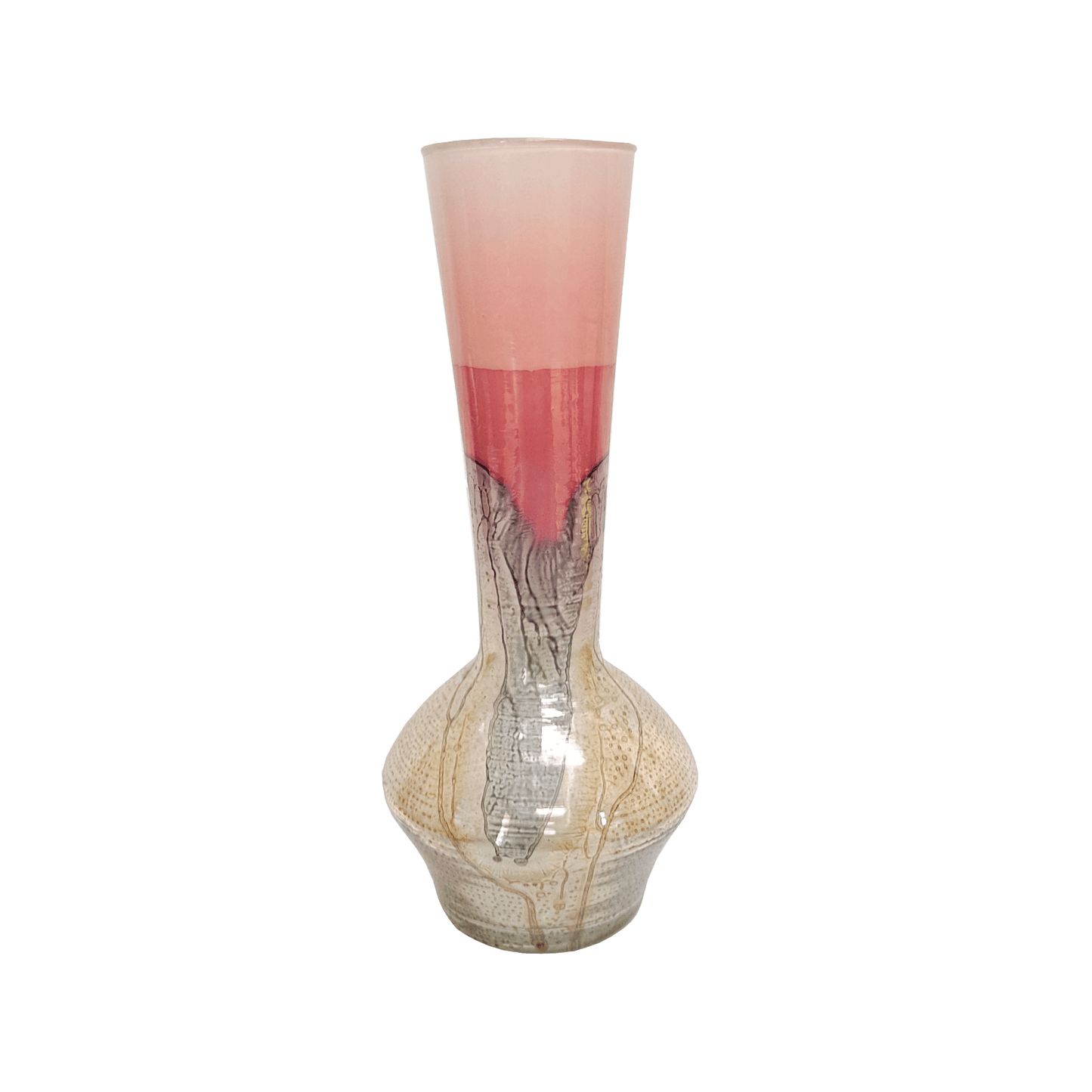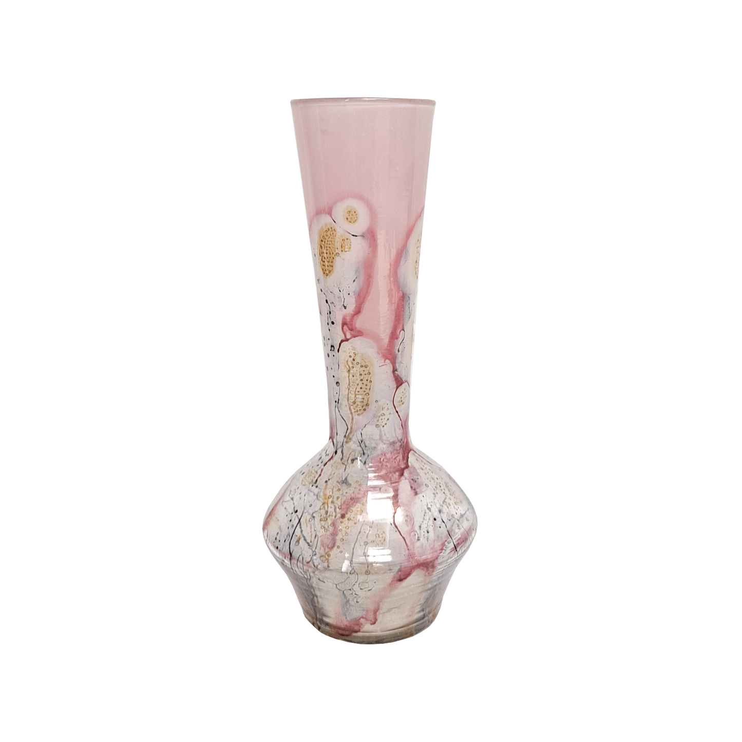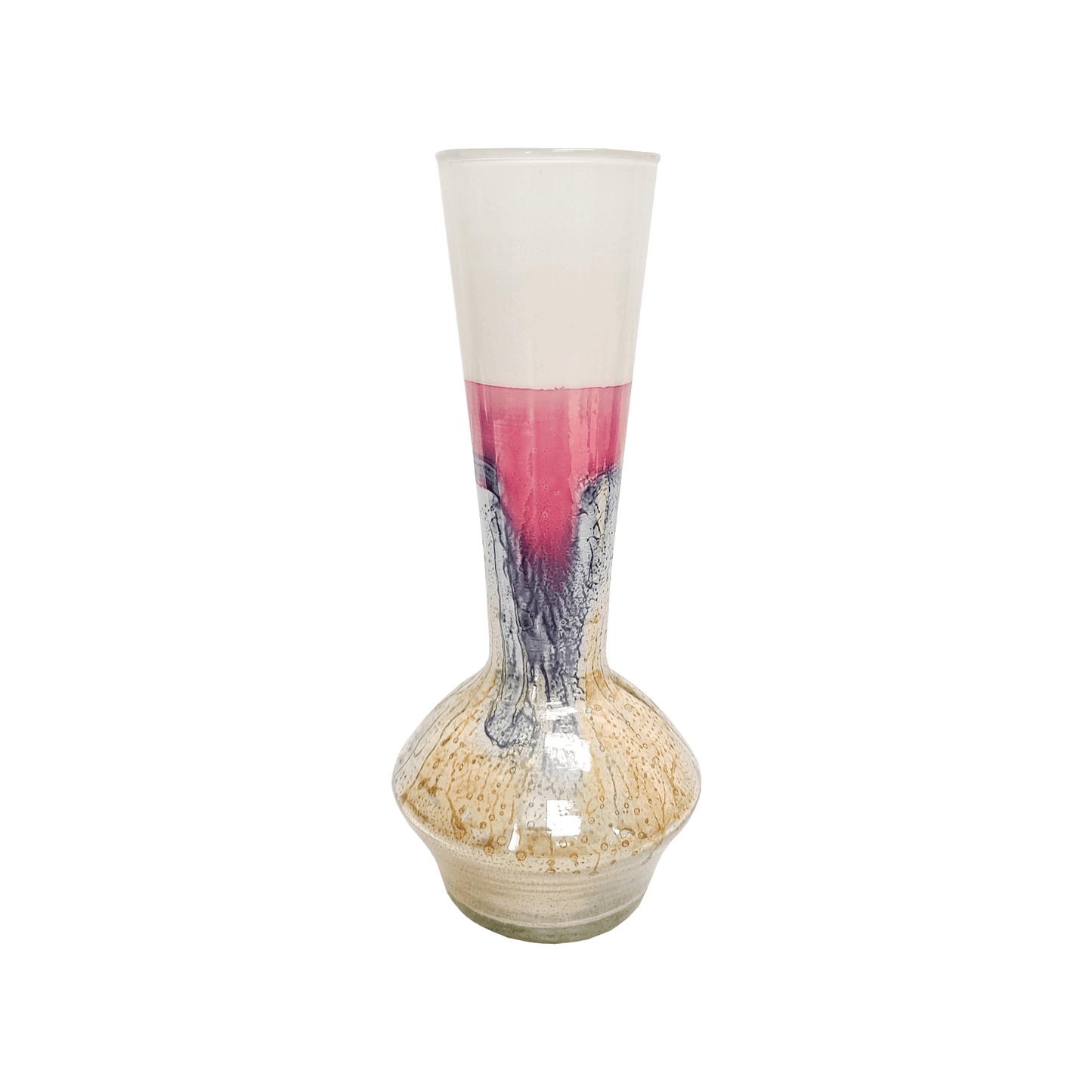 This exquisite trumpet glass vase by Simron, Israel, stands at 7.75 inches tall and showcases the artistry of handmade craftsmanship. Made from high-quality glass, this piece is hand-decorated with colored acid washes, creating an iridescent "oil on water" effect that resembles a watercolor painting. The colors give the vase a dynamic and ethereal appearance, making it a captivating addition to any space. Its unique design and delicate craftsmanship reflect the beauty and tradition of Israeli art.