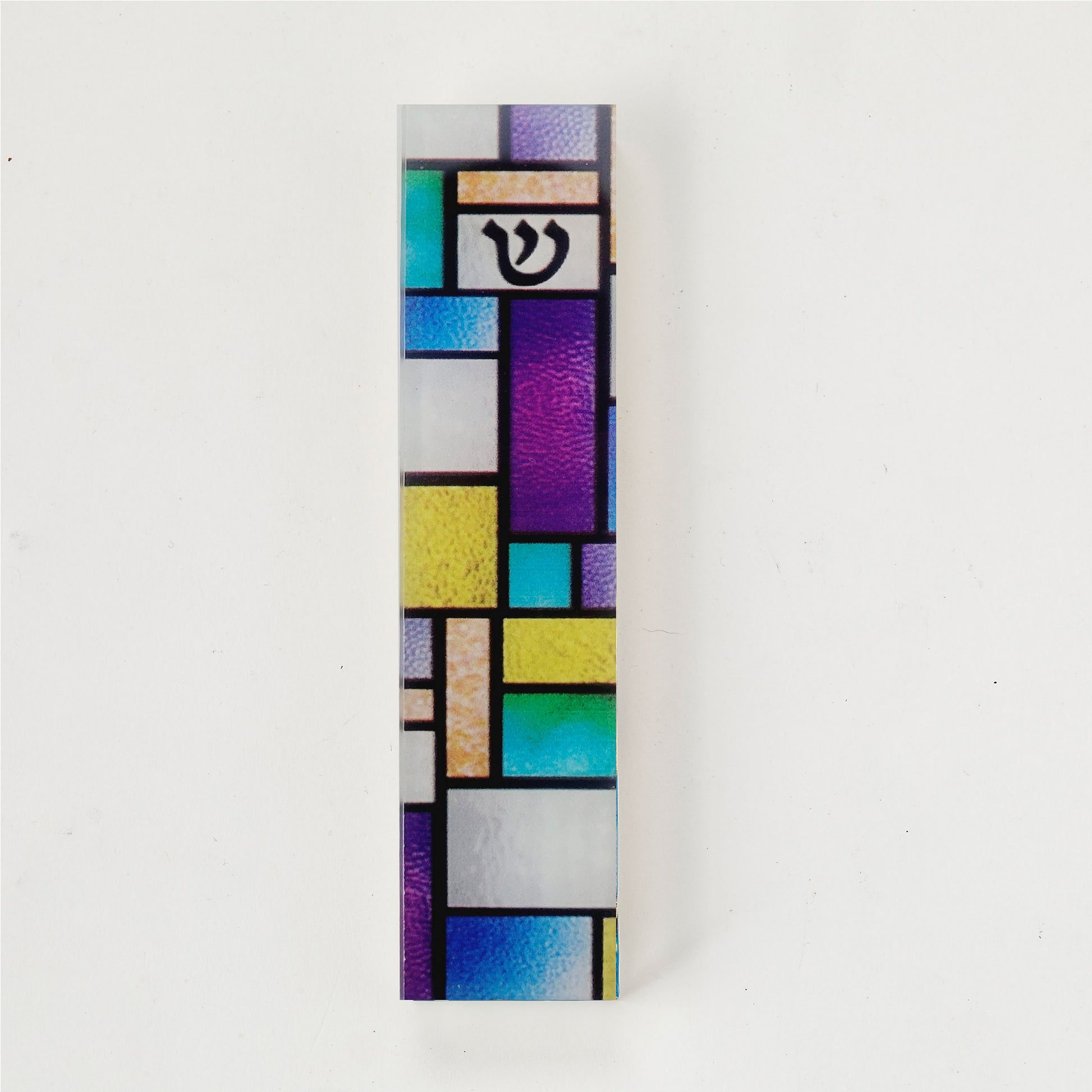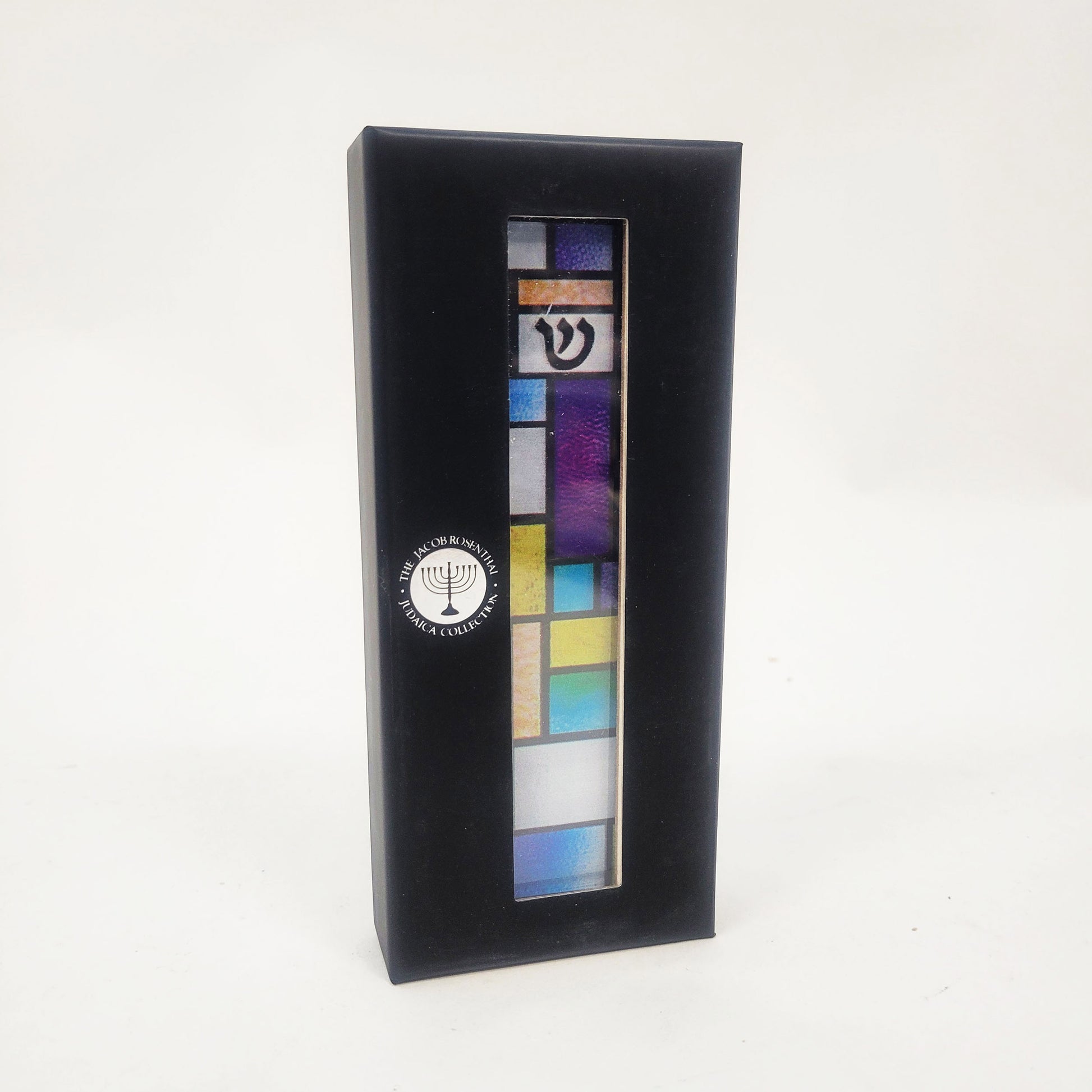 Elevate the level of art design in your home with this imaginative glass Mezuzah case! Sporting an abstract "Stained Glass look" (not actual stained glass) design, the colorful Mezuzah case brightens the day and will be a welcome addition to every doorway it is posted upon.