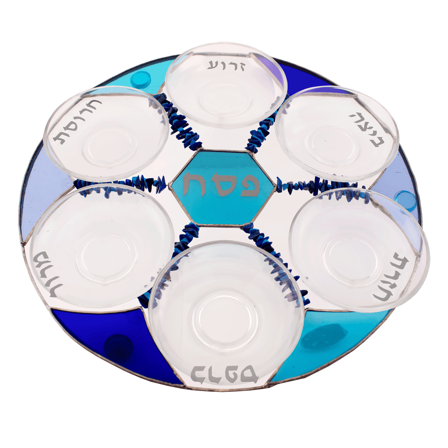 This exquisite stained glass Passover tray is a blend of artistry and tradition. The tray is crafted from clear glass, with pieces of varying blue glass artfully arranged around the edge, creating a serene and elegant border. The sections are divided by strung beads, adding texture and a touch of sophistication to the design. The tray includes six clear dishes, each perfectly sized to hold the elements of the Seder. The names of the elements are delicately etched in Hebrew on the tray, enhancing its spiritual significance. This tray is both a functional and stunning piece, enhancing the beauty and significance of your Passover celebration.