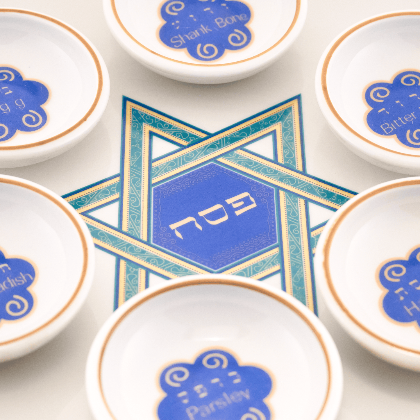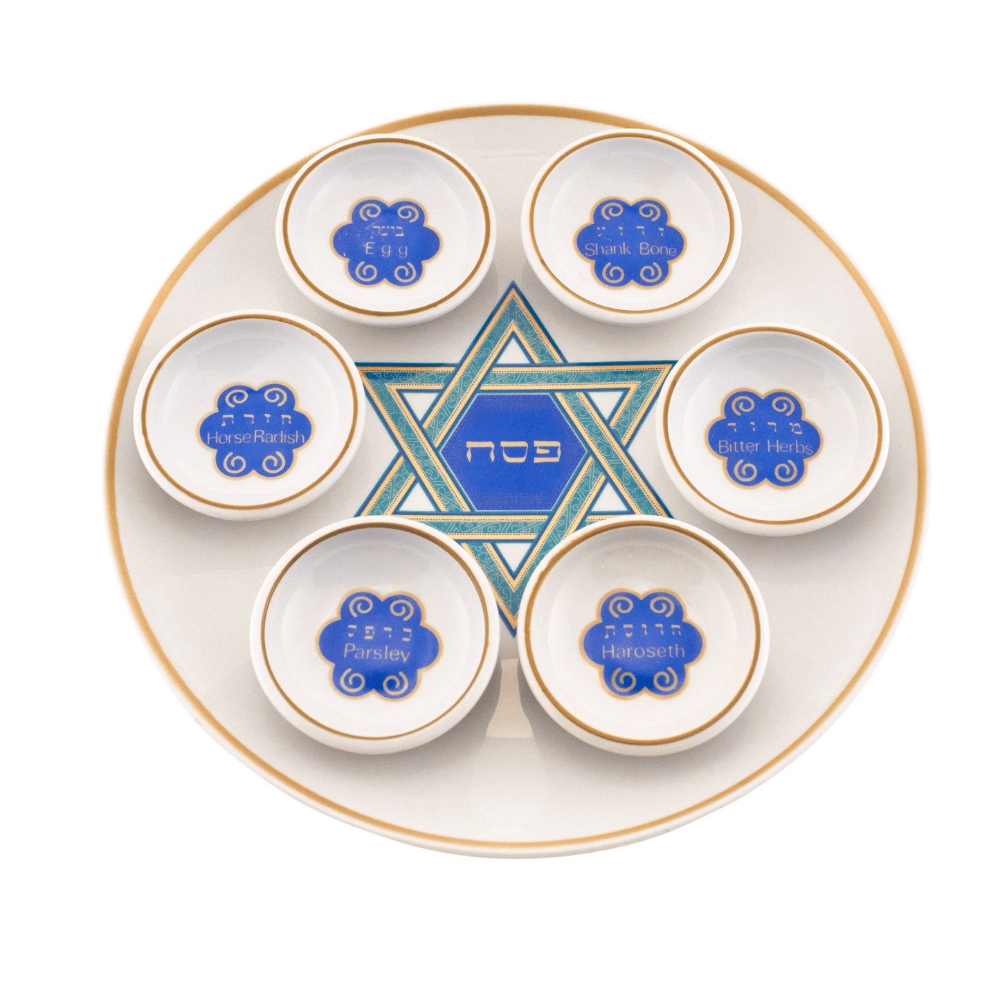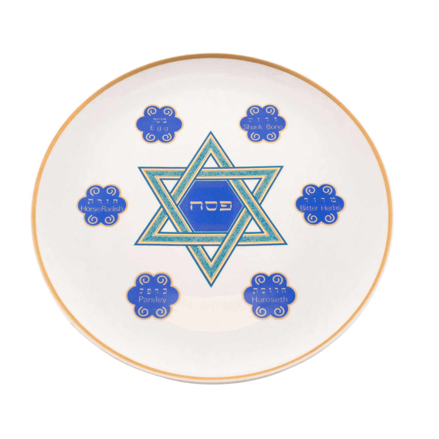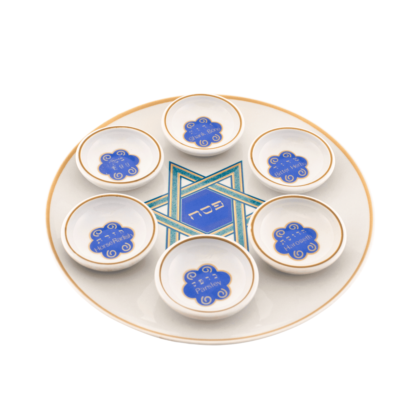 This elegant Passover plate by Naaman is crafted from pristine white porcelain, offering a timeless and refined addition to your Seder table. The set includes a large plate accompanied by six smaller dishes, each designed to hold the symbolic foods of the Passover Seder. With their delicate craftsmanship, the small dishes fit perfectly on the main plate, ensuring an organized and beautiful presentation. Made in Israel, this Passover plate set embodies quality and tradition, making it a cherished piece for your holiday celebrations.