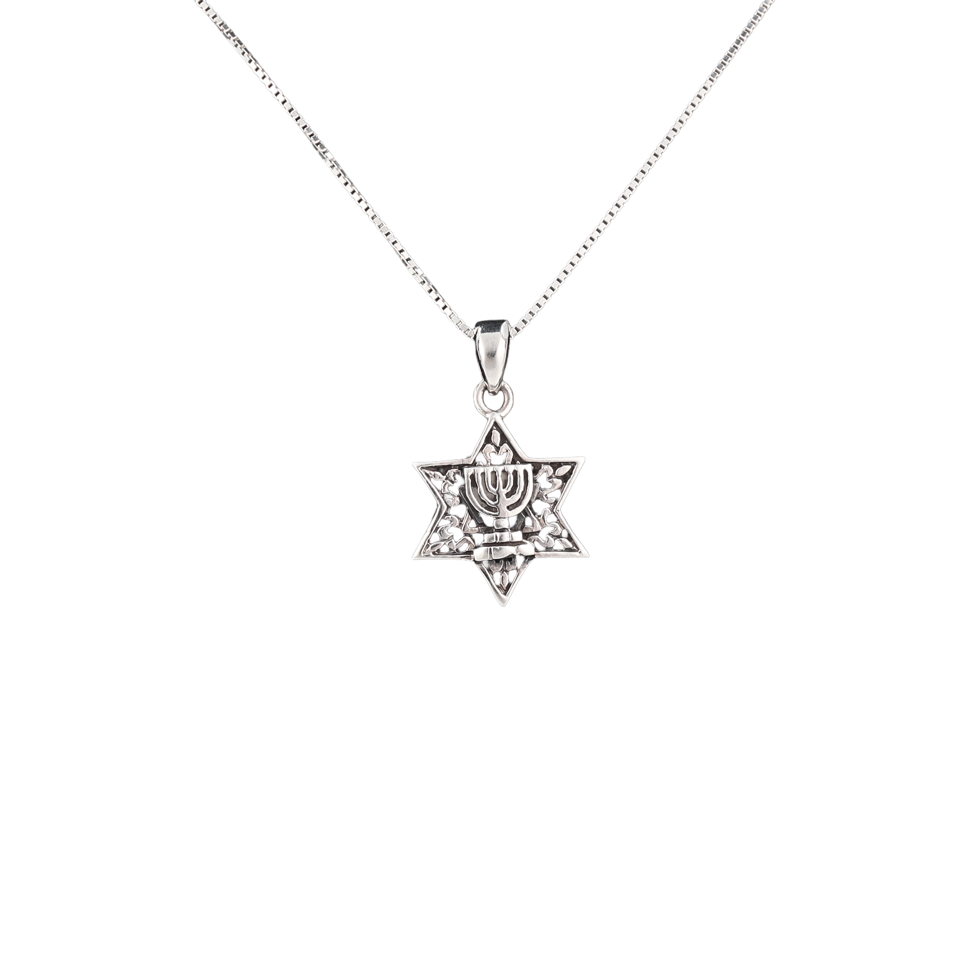 A meaningful pendant featuring a classic Star of David paired with a menorah motif. Set in a clean, polished design and ready to wear on a chain, it’s a symbolic piece with simple elegance—perfect for daily wear or as a thoughtful gift.
