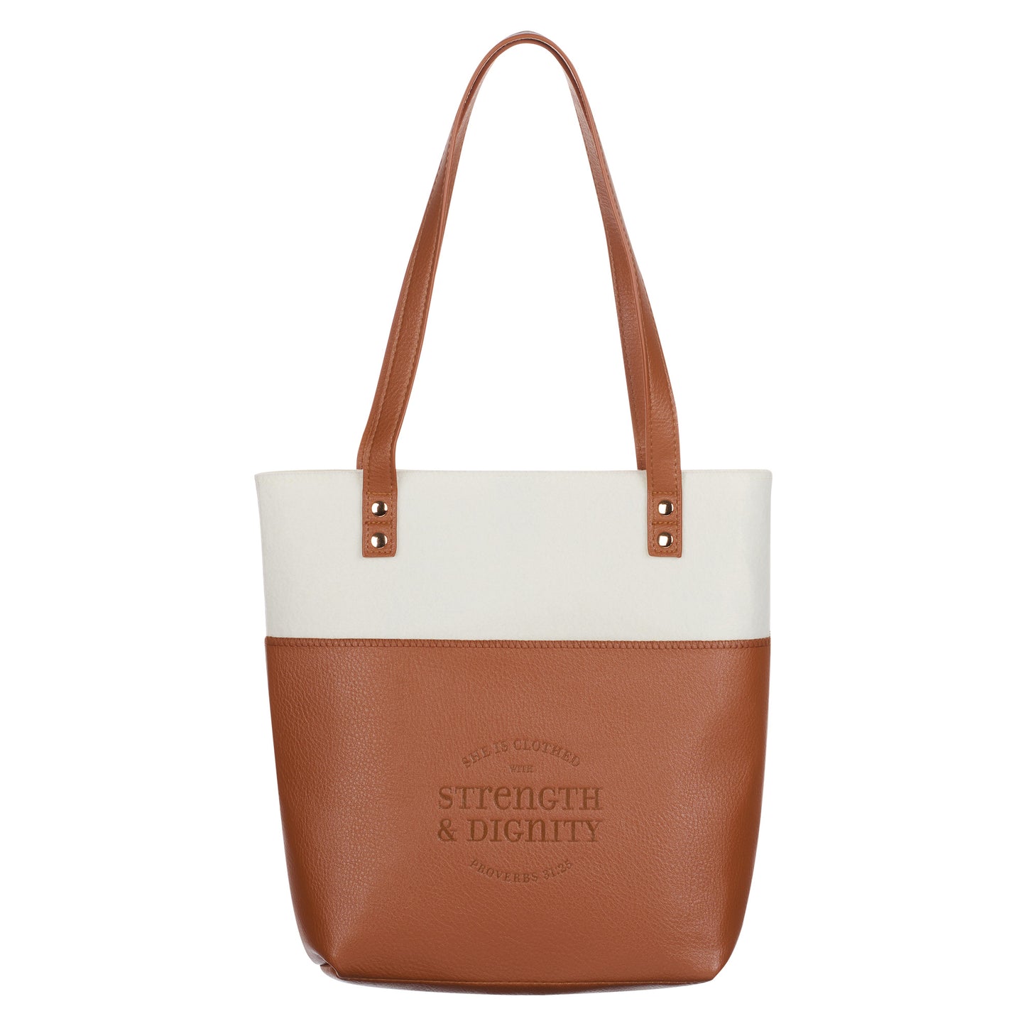 Strength & Dignity Two-tone Toffee and Cream Felt Fashion Bible Tote Bag - Proverbs 31:25