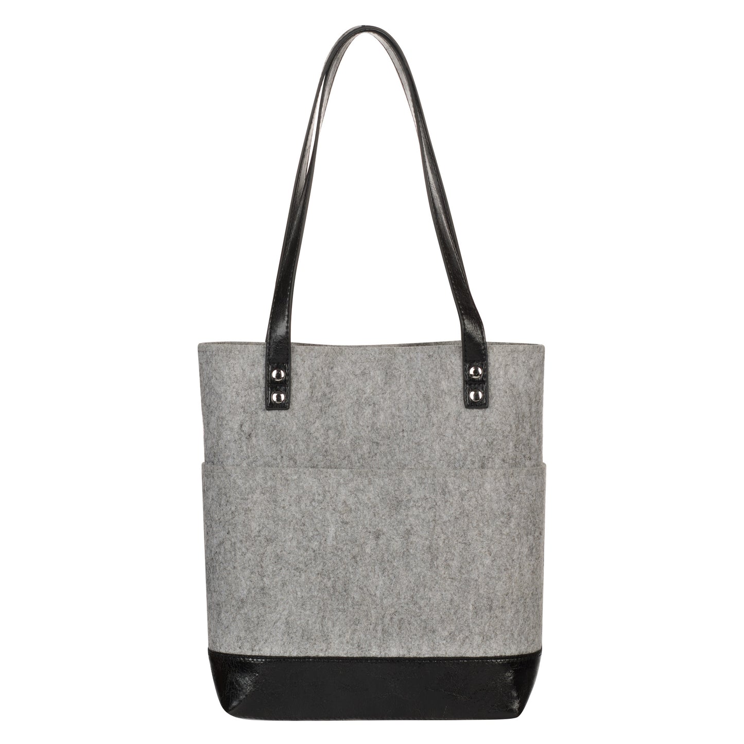 The tote's soft gray felt exterior is wrapped with an oversized pocket covering two-thirds of the body. A silver metal badge filled with black epoxy surrounding silver raised letters spells out the encouraging sentiment of the tote.