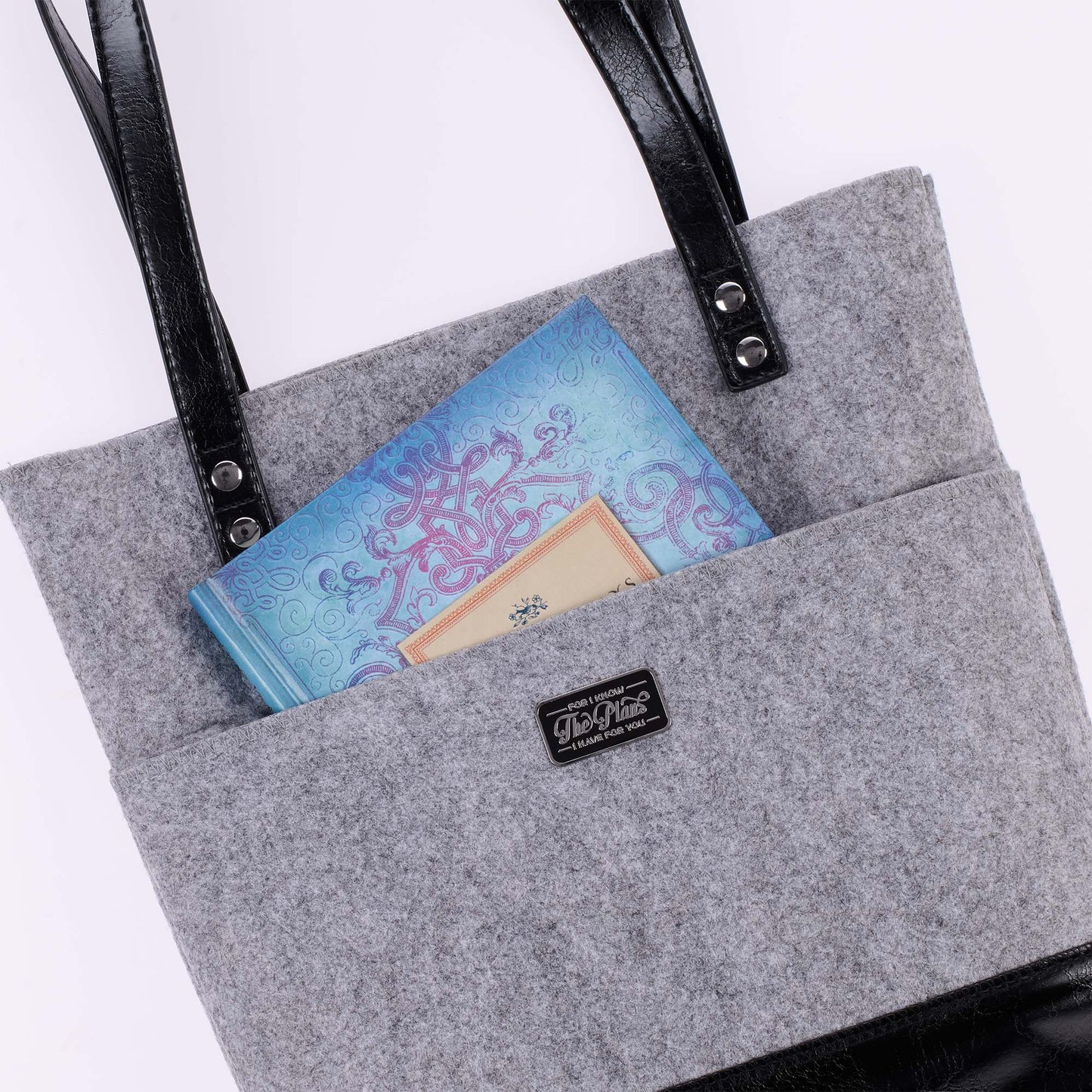 Carry your books in style with The Plans Heather Gray Felt and Black Faux Leather Fashion Bible Tote Bag —a tote with a handsome exterior and a roomy interior large enough to hold all the books, keys, and any incidentals you may need.