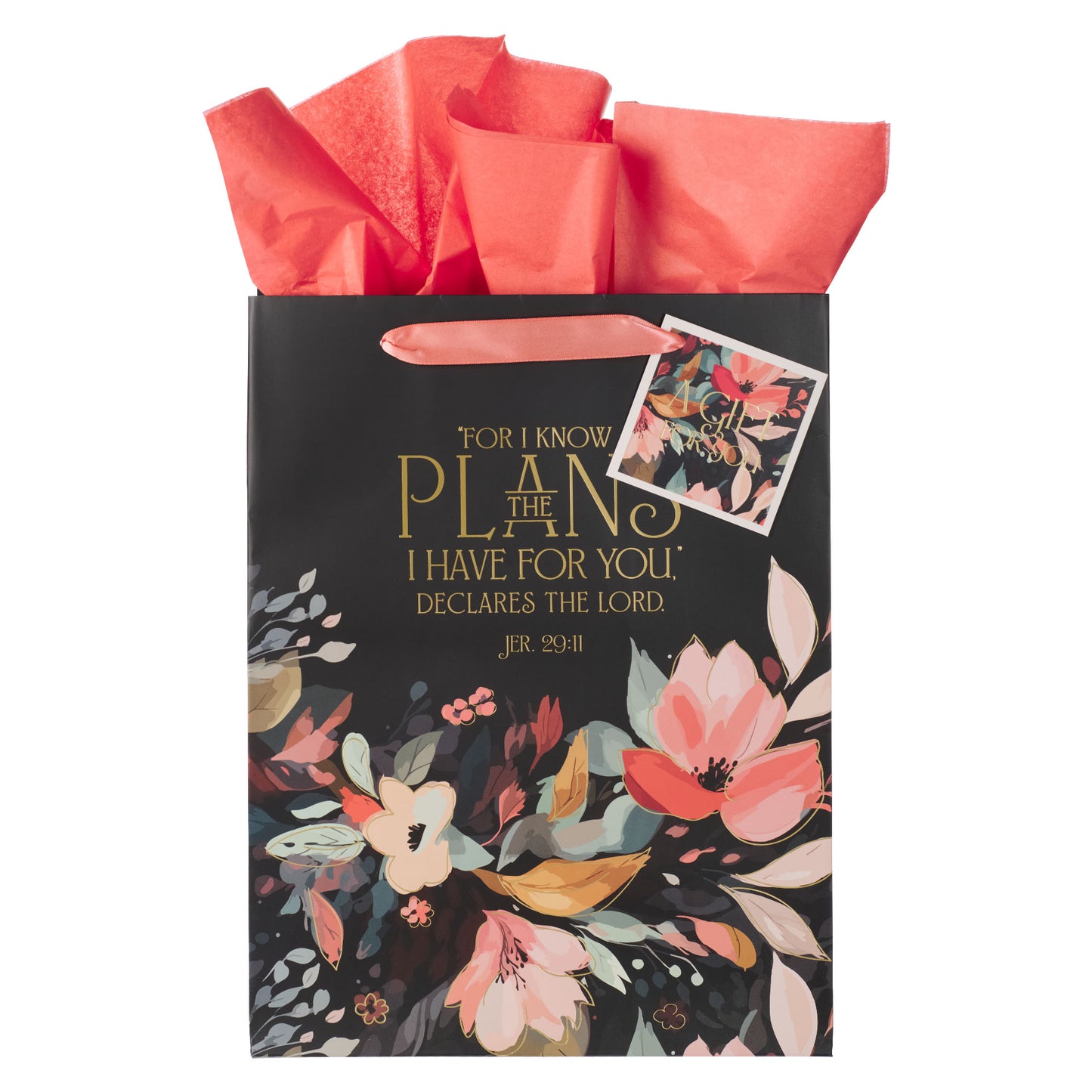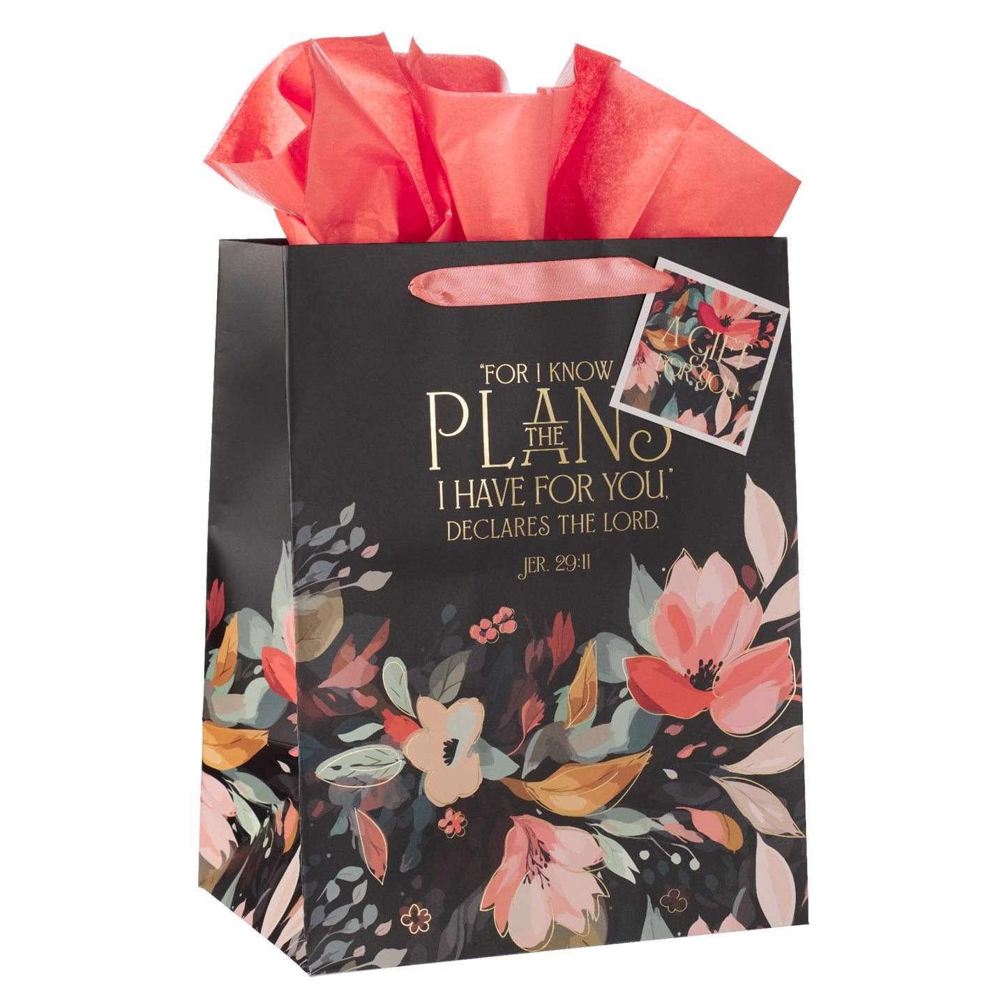 The gift bag comes with two coral-pink sheets of tissue paper to enhance the presentation of your gift. These tissue sheets match the two coral-pink satin ribbon handles. A square gift tag featuring a floral design against a black background is framed in white and threaded through one of the handles. The tag displays a gold-foiled sentiment on the front and has space on the back for a personal message.