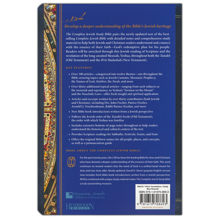 Christians and Messianic Jews who are interested in the rich spiritual traditions of their faith will be thrilled with this brand-new study Bible. The Complete Jewish Study Bible pairs the updated text of the Complete Jewish Bible translation with extra study material, to help readers understand and connect with the Jewish heritage of the Christian faith.