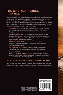 The One Year Bible for Men uses the renowned “read through the Bible in a year” structure of The One Year Bible to create a men’s devotional Bible, with the addition of two-minute daily devotionals created for the male reader, addressing issues like anger, wisdom, wealth, temptation, and many others. This Bible is the first men’s Bible in the One Year collection. This edition of The One Year Bible for Men is in the King James Version and provides the structure for men to read the Bible in one year, in 15 minutes a day.