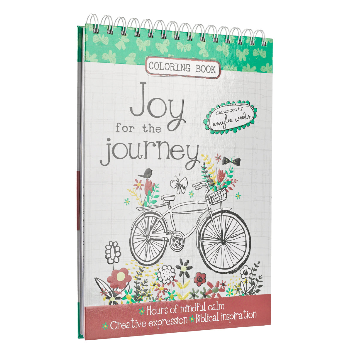 The glossy hardcover of the Joy for the Journey Wirebound Coloring Book is white and features an incomplete coloring page picturing a whimsical bicycle and flower design. The title is embossed in black.