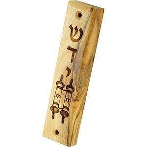 This olive wood mezuzah case has an attractive design etched into it of a Torah scroll.